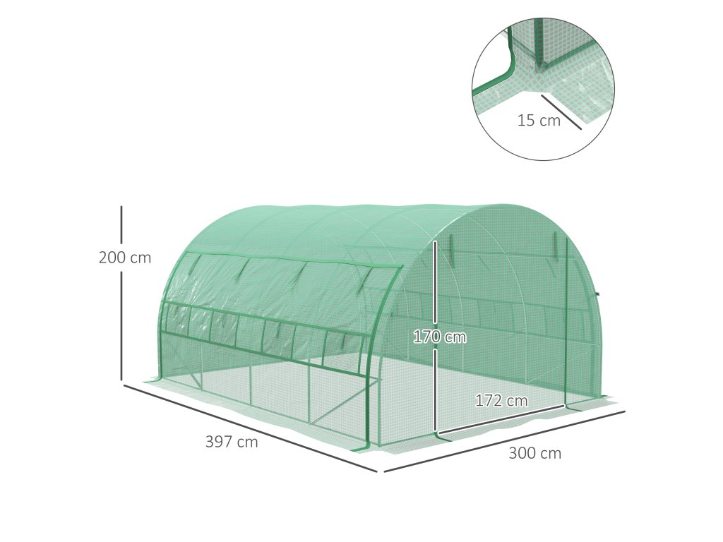 Outsunny polytunelový skleník 3,97x3x2m Walk-in, UV ochrana, rolovací kryty, ocel, zelený| Aosom