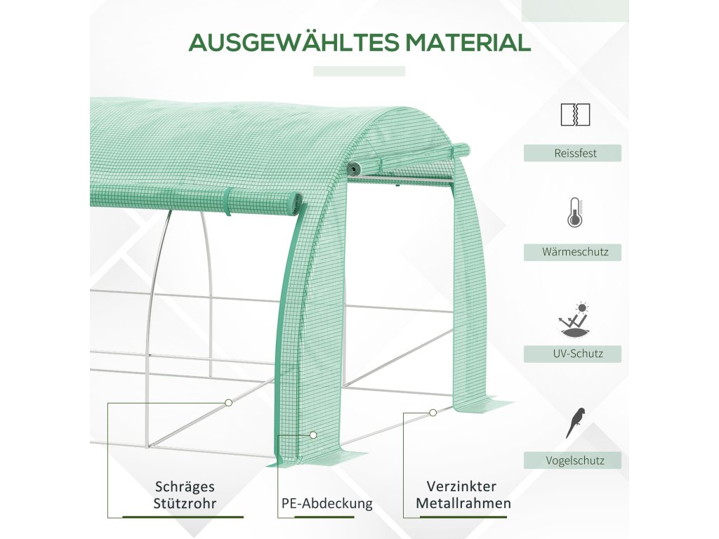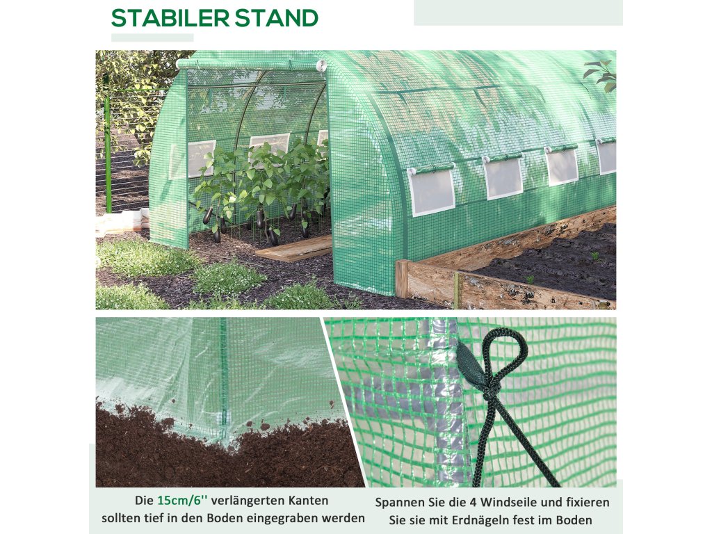 - Robustní konstrukce: Na tento skleník se můžete spolehnout: Rám z pozinkované oceli a čtyři další šikmé podpěrné tyče zajišťují vysokou stabilitu a pevnost.