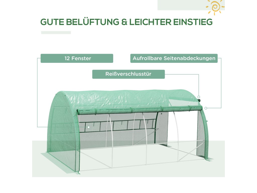 Prožívejte svou vášeň pro zahradničení po celý rok! Tento praktický skleník vám díky plně rolovacím bočním krytům nabízí dostatek prostoru pro práci. Vstupní dveře lze pohodlně otevírat a zavírat pomocí zipu a extra dlouhé okraje krytu lze v případě potřeby zahloubit do země, aby se zabránilo cirkulaci vzduchu. Vytvořte si zahradu snů ještě dnes s tímto skleníkem od společnosti Outsunny!