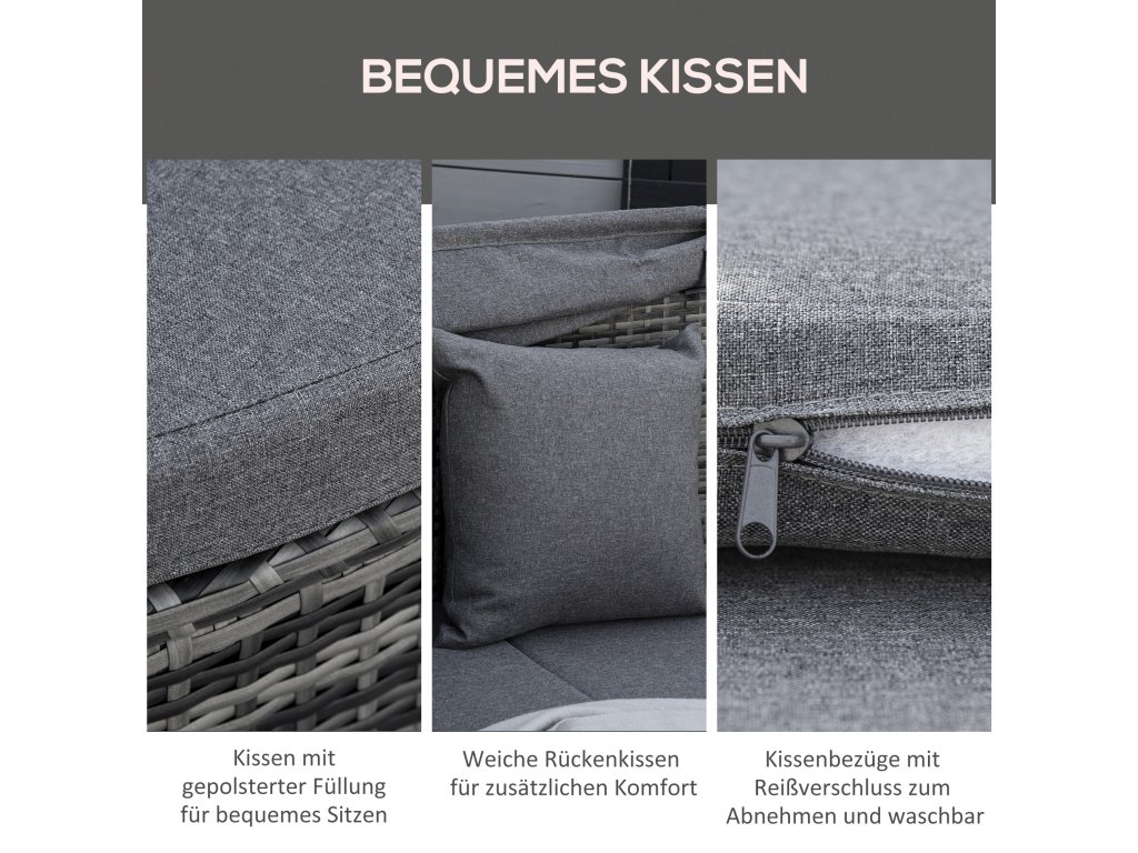 Trendy a všestranná ratanová sedací souprava PE od společnosti Outsunny. Souprava se skládá z 1 pohovky pro tři osoby, 2 taburetů a 1 otomanu. Pozinkovaný trubkový rám poskytuje pevnou a robustní konstrukci, obalenou PE ratanem, který poskytuje ochranu před nepřízní počasí. Tuto soupravu doplňují polstrované polštáře s odnímatelnými a pratelnými potahy a velká stříška.