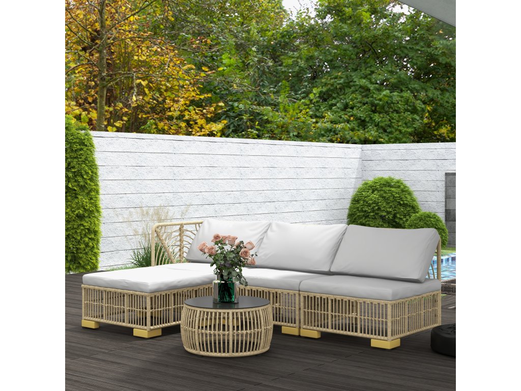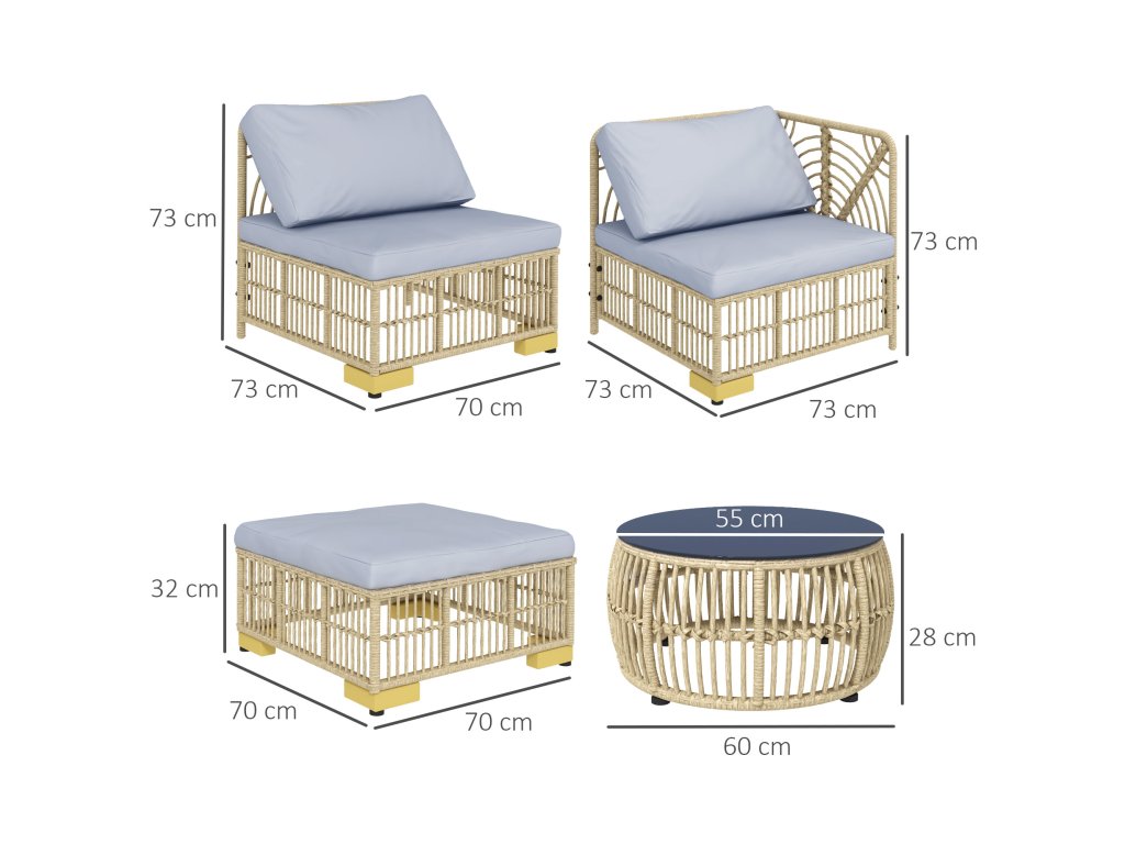 Zkrášlete svou zahradu a udělejte si zvenčí stejně příjemný domov jako zevnitř. Tato pětidílná sada zahradního nábytku od společnosti Outsunny má robustní ocelový rám odolný proti korozi a obložení z umělého ratanu odolného proti povětrnostním vlivům. Vynikající způsob, jak proměnit zahradu, terasu nebo prostor u bazénu v malý ráj pro odpočinek. Dekorativní a funkční sada vytváří příjemnou atmosféru, kterou si vy i vaše rodina budete užívat po celý rok.
