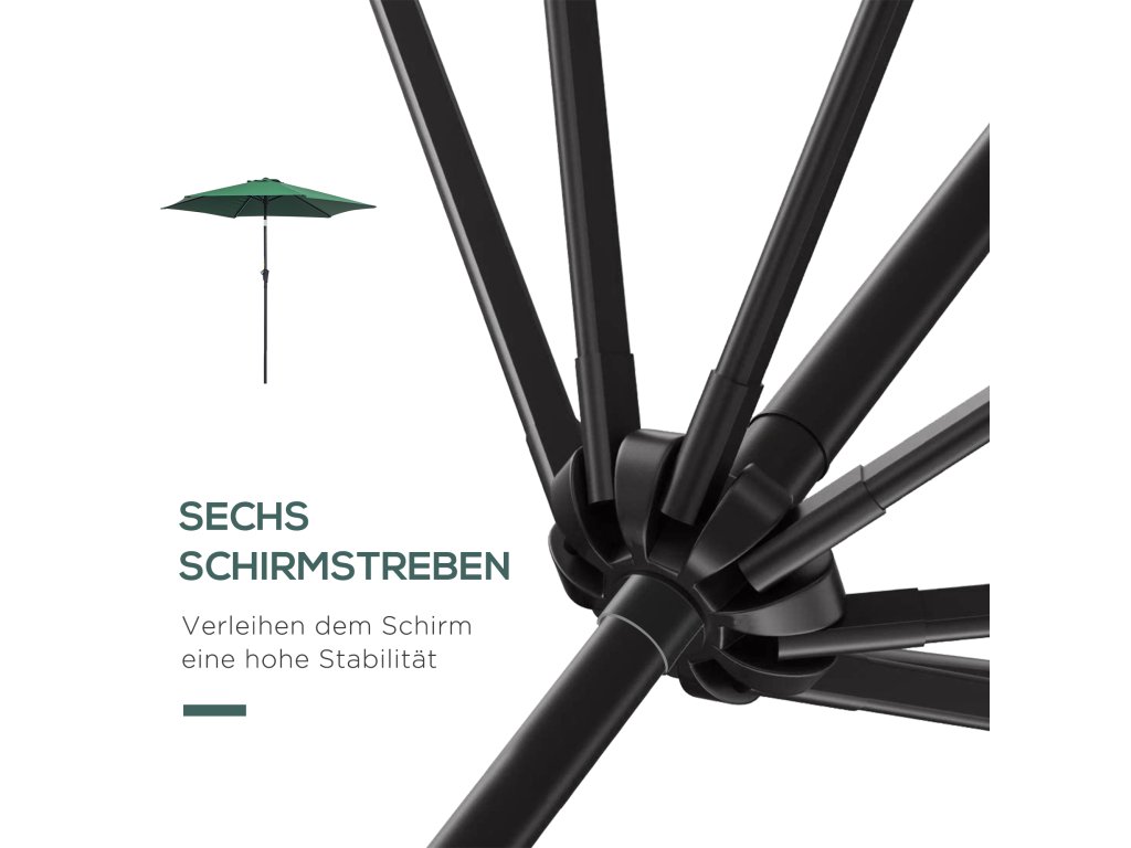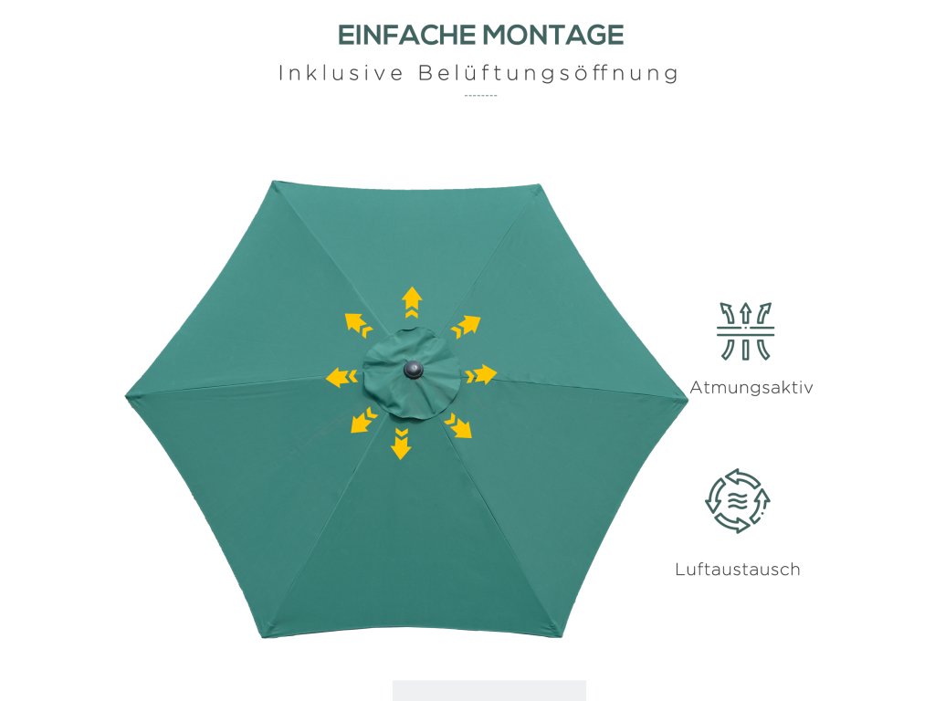 - ✔ Potah slunečníku je vyroben z polyesteru o hmotnosti 180 g/m² a je vodoodpudivý a odolný vůči UV záření
