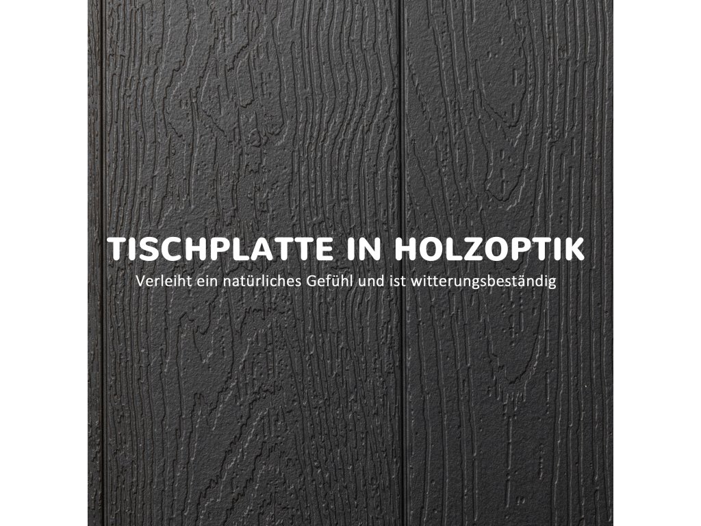 - Dekorativní dřevěný vzhled: Robustní deska stolu je vyrobena z odolného, voděodolného plastu a má rustikální dřevěný vzhled, který se hodí do každého venkovního prostoru. Díky hladkému povrchu se deska stolu velmi snadno otírá.