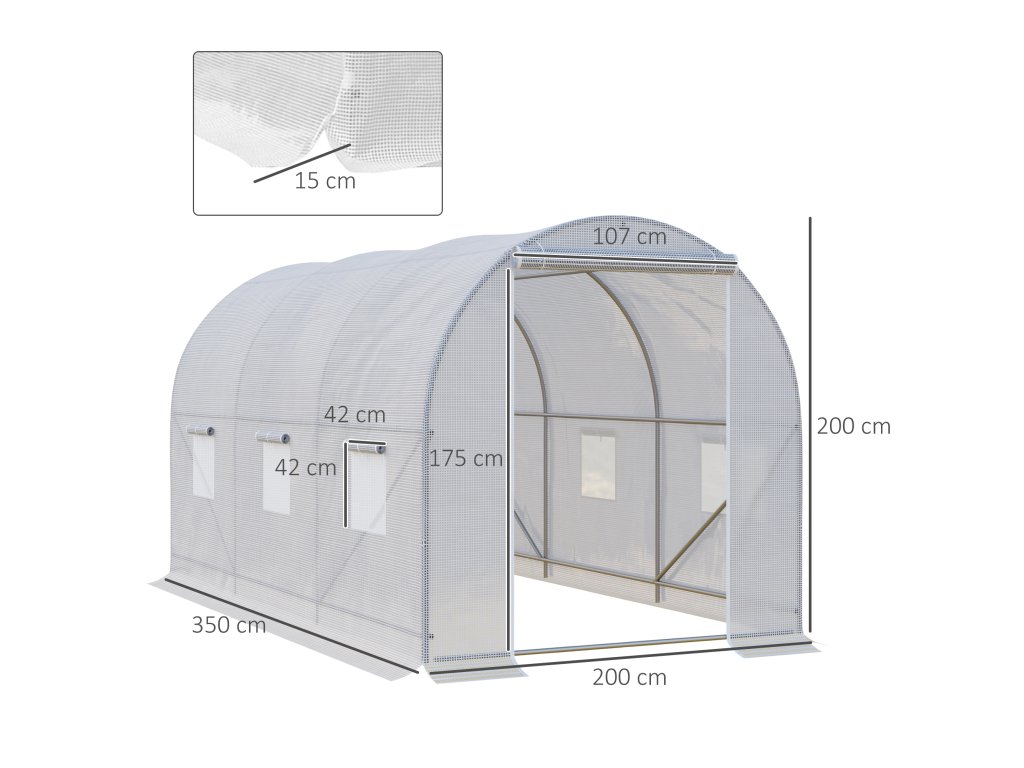 - CELKOVÉ ROZMĚRY: 350L x 200W x 200H cm; POZNÁMKA: Abyste prodloužili životnost skleníku, měli byste jej samostatně zpevnit proti nepříznivým povětrnostním vlivům (vítr, déšť, sníh, kroupy atd.). Nepoužívejte prosím kyselé pesticidy, aby nedošlo k chemickým reakcím se zásaditým PE krytem, které by mohly způsobit poškození.