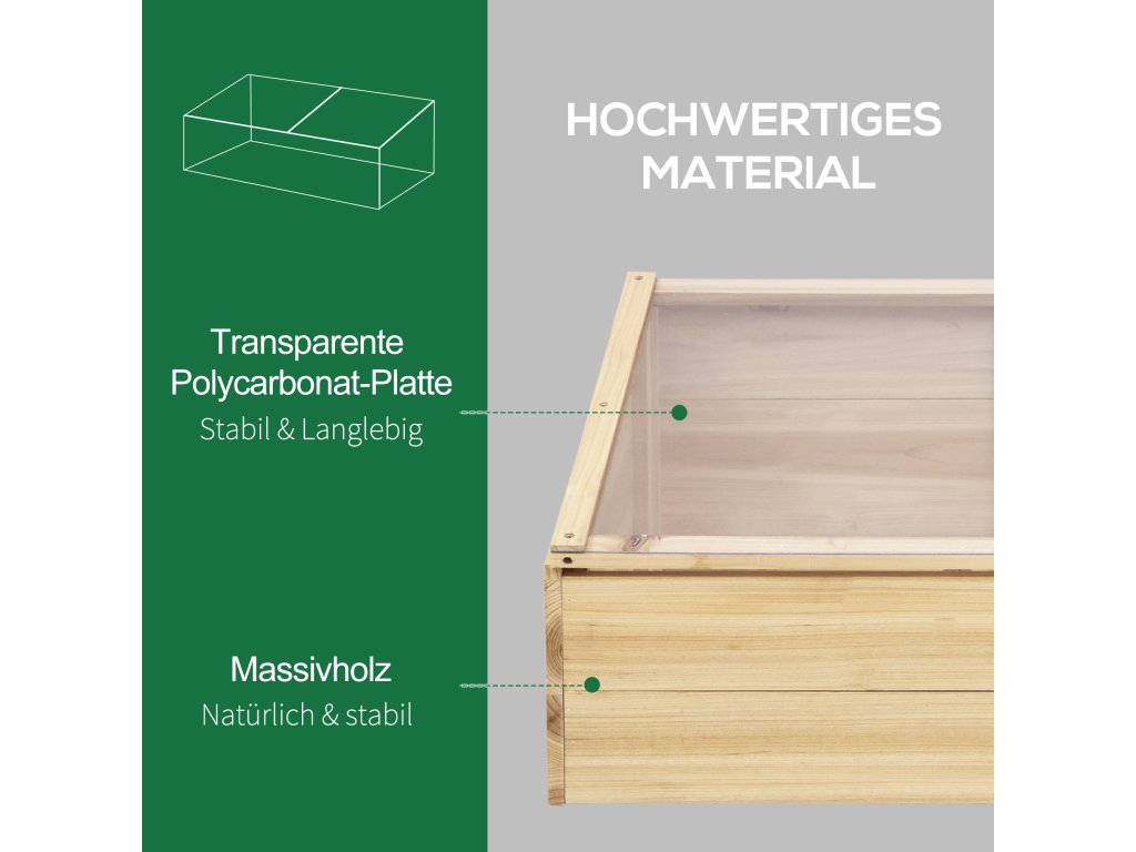 Tento výjimečný dřevěný skleník od společnosti Outsunny pomáhá vašim rostlinám růst a prospívat. Kvalitní rám z masivního dřeva tvoří spolehlivý malý skleník. Průhledné polykarbonátové panely umožňují maximální propustnost světla a zároveň udržují teplo pro časné klíčení semen nebo pro ochranu rostlin v pozdním období. Tento pěstební záhon poskytuje prostor s ideální teplotou, vaše rostliny si mohou užívat slunečního světla a zdravě růst.
