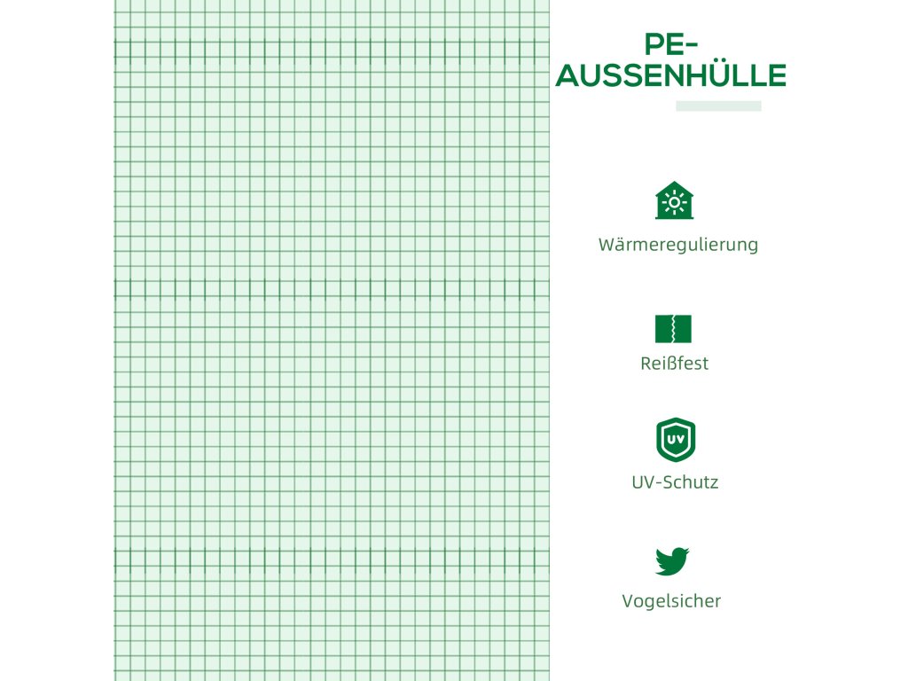 - OCHRANNÝ KRYT: Plně uzavřený, vodotěsný a UV záření odolný kryt umožňuje průchod vysoce energetického slunečního světla a v případě potřeby dokáže udržovat vysokou úroveň vlhkosti. Prodloužené okraje o 10 cm jsou zanořeny hluboko do země, aby se kryt ještě více stabilizoval a napnul a nedocházelo na něm k hromadění vody.