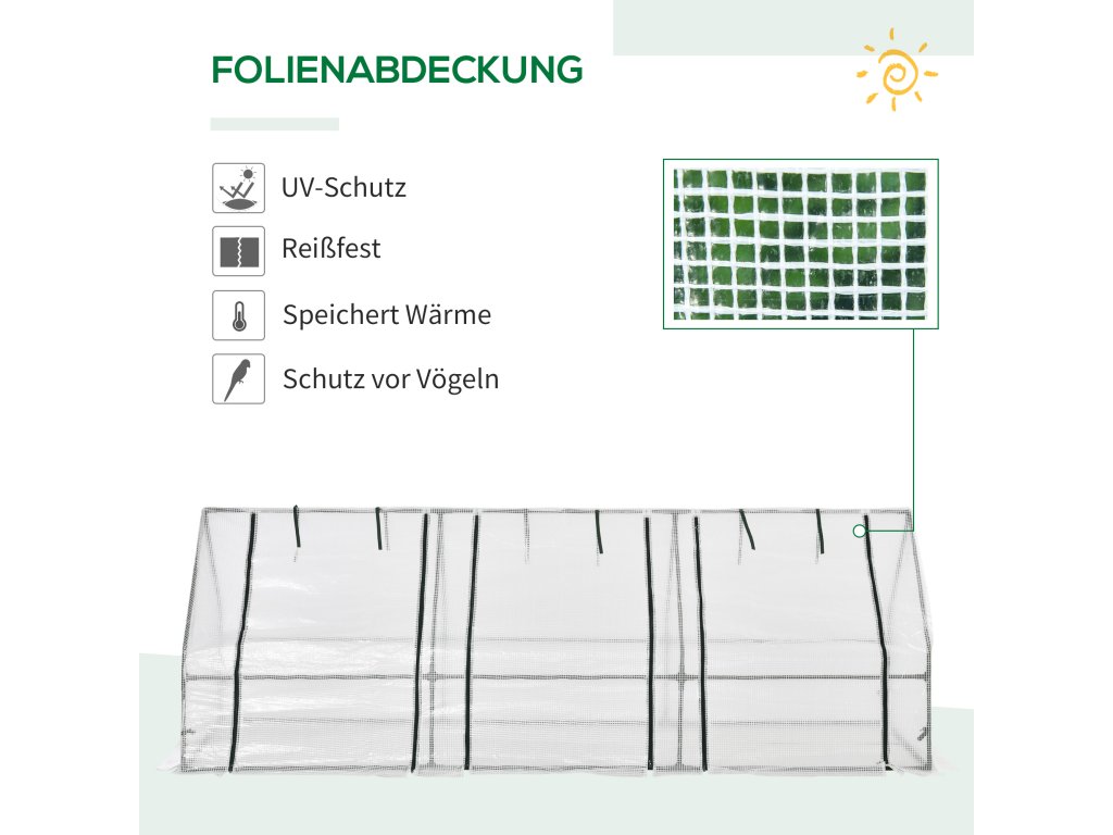 - Odolný vůči povětrnostním vlivům: Vaše drahocenná semínka jsou dobře chráněna před mrazem a nepřízní počasí. Umožňuje to PE fólie o hmotnosti 140 g/m². Ta je navíc odolná proti UV záření a trvanlivá.
