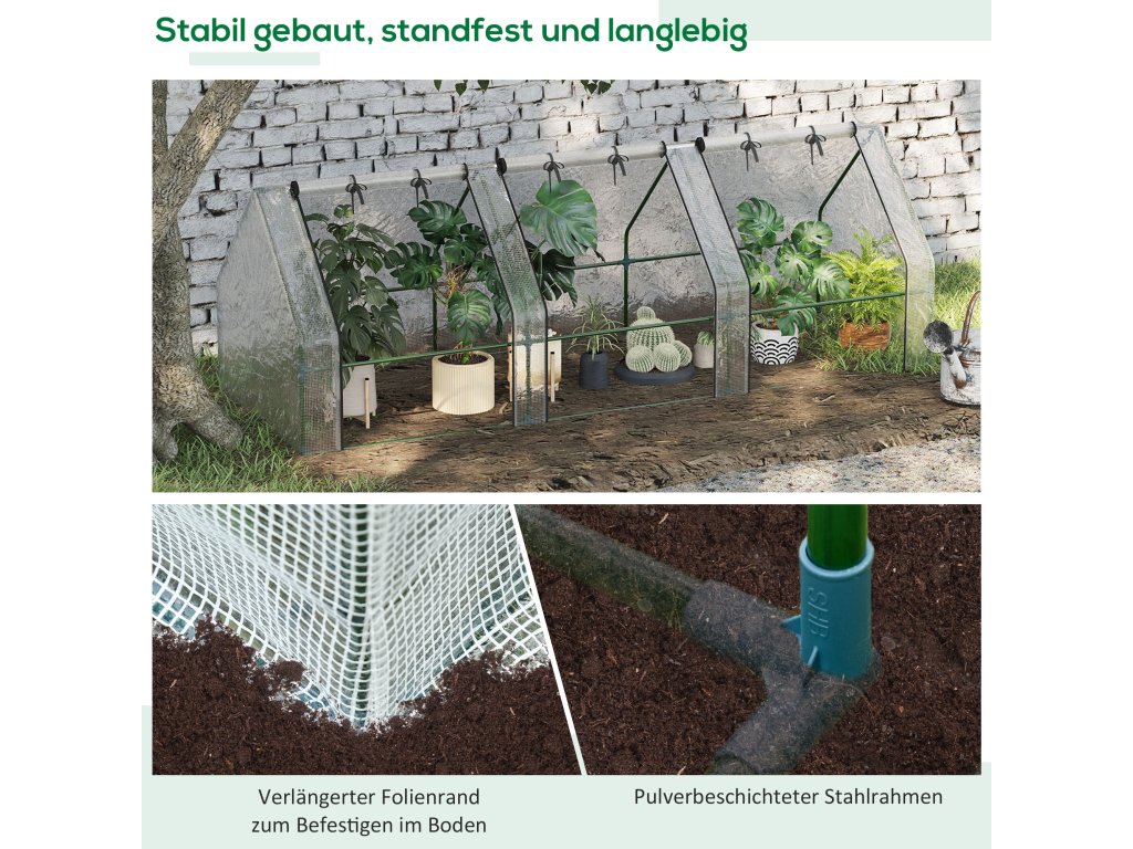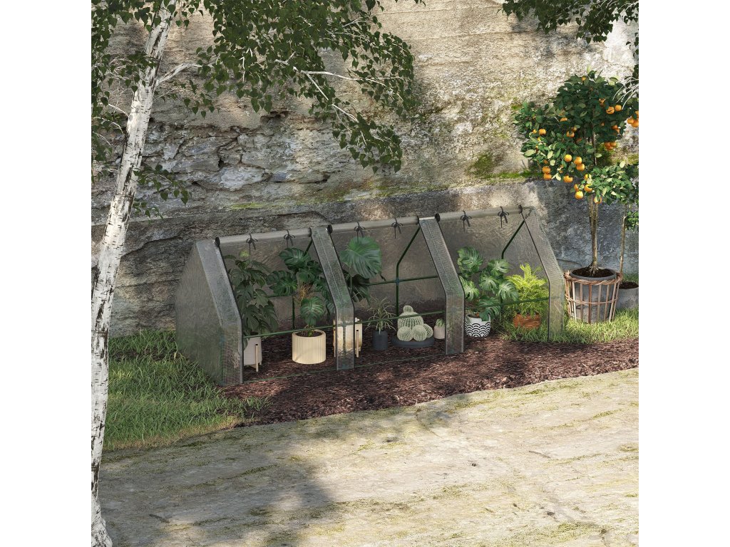 Jste nadšený domácí zahrádkář, který chce být aktivní po celý rok? Poskytněte svým rostlinám dokonalou ochranu před nepříznivým počasím s naším skleníkem od společnosti Outsunny! Náš skleník je vyroben z vodoodpudivé a průsvitné fólie a nabízí dostatek prostoru pro pěstování ovoce, zeleniny a květin. Nejenže chrání vaše rostliny před povětrnostními vlivy, ptáky a hmyzem, ale také podporuje růst regulací teploty a vlhkosti. Díky mimořádně dlouhé fólii a dodávanému příslušenství již není problémem montáž a upevnění na různých površích! Tip: Fólie je na každé straně o 10 cm delší než kovové trubky, spodní okraj lze zapustit do země nebo zatížit kameny. Díky tomu je skleník stabilnější;