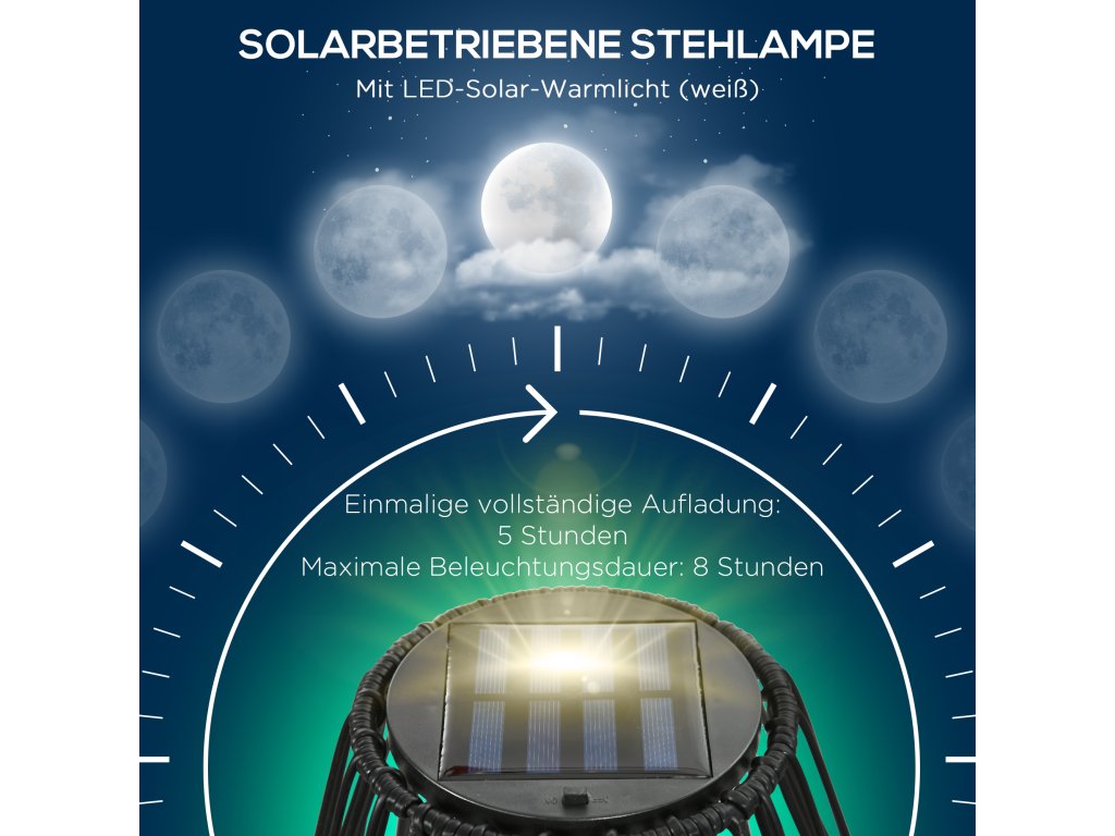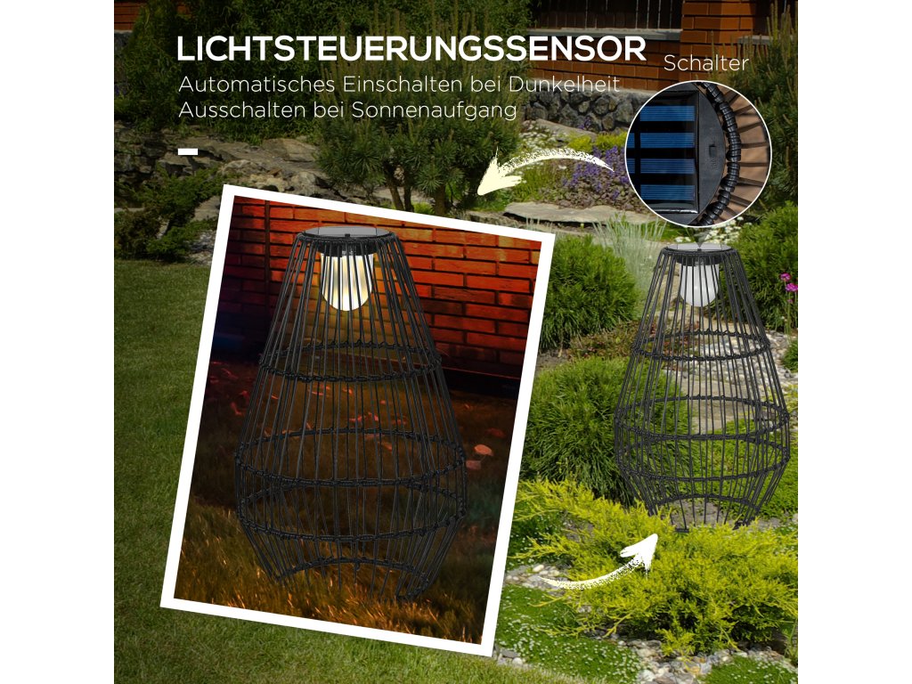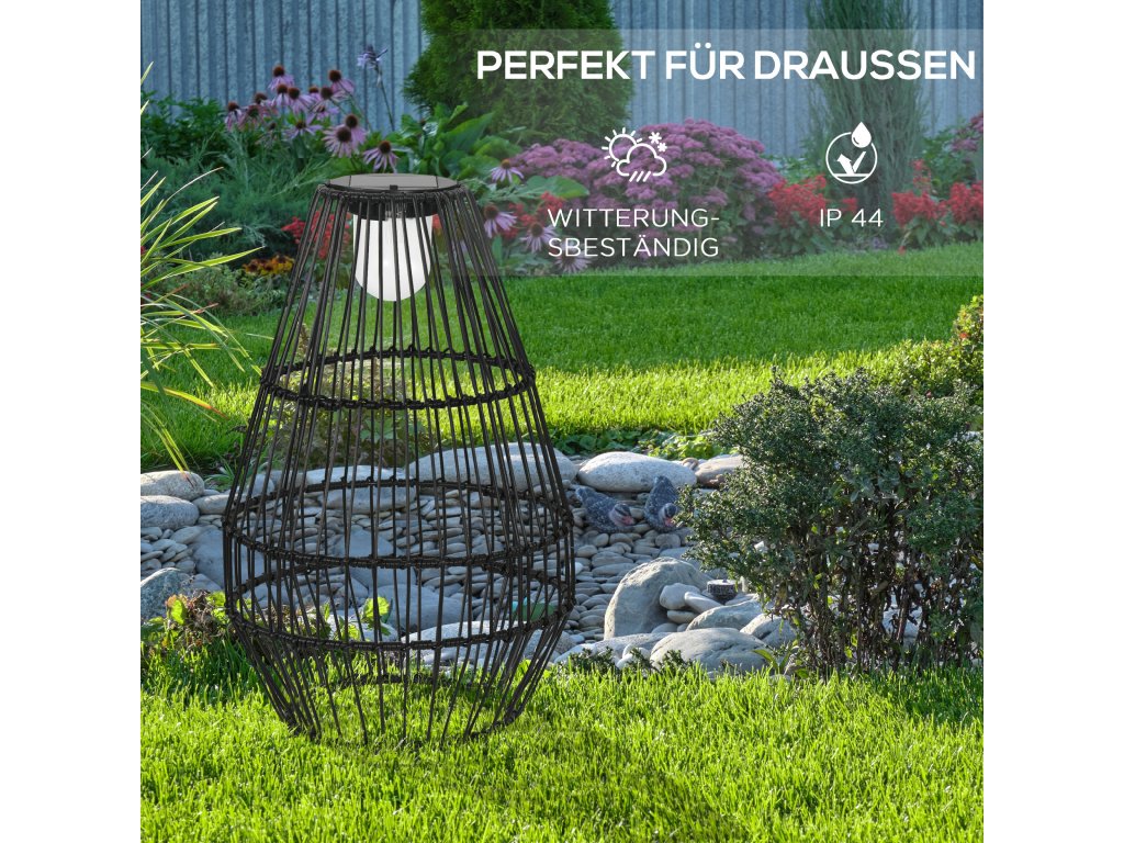 - Vysoce kvalitní materiál: Toto solární venkovní svítidlo má ocelový rám s práškovým nástřikem a ochrannou dekorativní venkovní klec z plastového ratanu. Světlo je vodotěsné a vhodné do všech povětrnostních podmínek (třída krytí IP44) a je ideální pro trvalé venkovní použití.