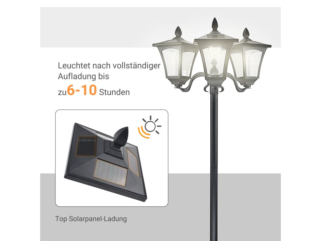 - ✔ Energeticky úsporná zahradní lampa má 3 světla, z nichž každé obsahuje 4 solární panely a-Si
