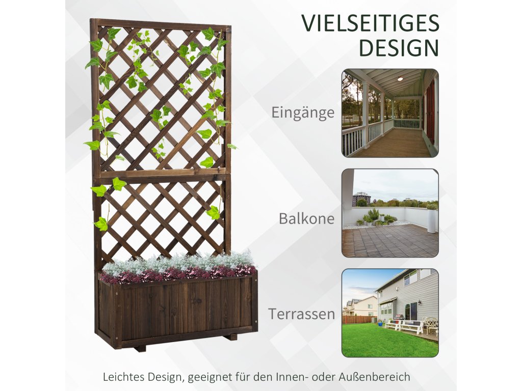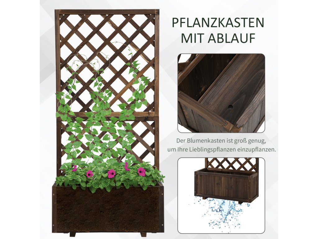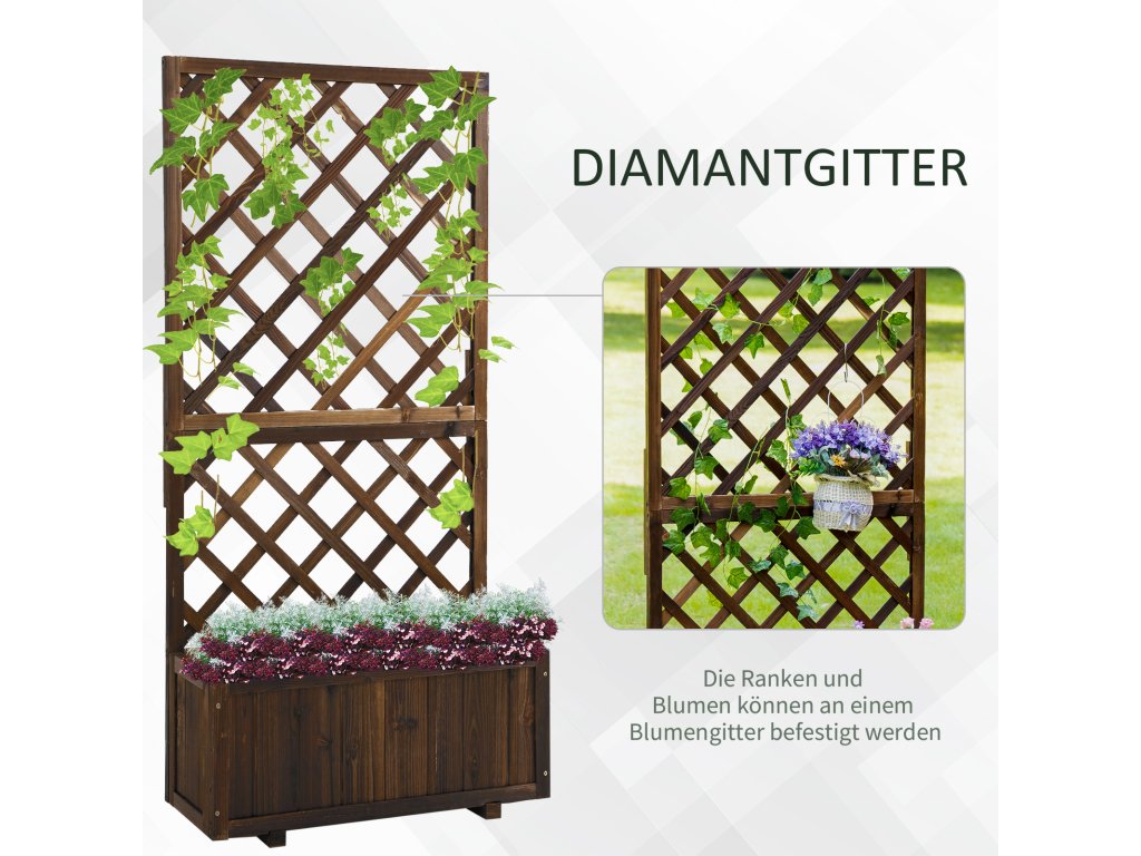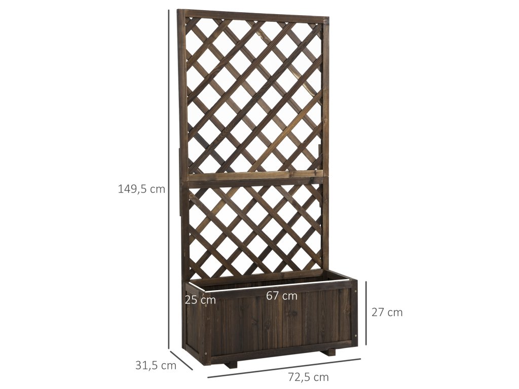 S tímto rustikálním květinovým truhlíkem od společnosti Outsunny můžete vkusně vystavit své oblíbené rostliny a dodat venkovnímu prostředí osobitý nádech! Robustní mříž poskytuje ideální příležitost k pěstování dekorativních popínavých rostlin a vkusně doplní vaši zahradu. Rám z masivního dřeva odolného proti povětrnostním vlivům chrání truhlík na květiny před každým počasím a umožňuje trvalé používání vyvýšeného zahradního záhonu venku.