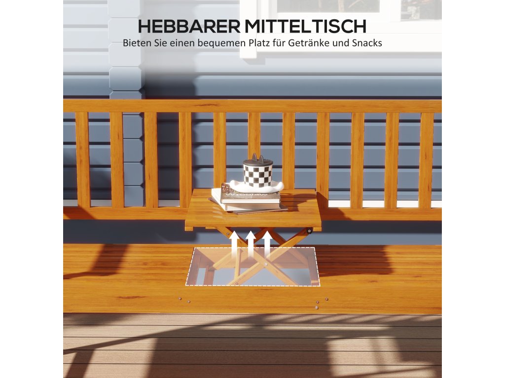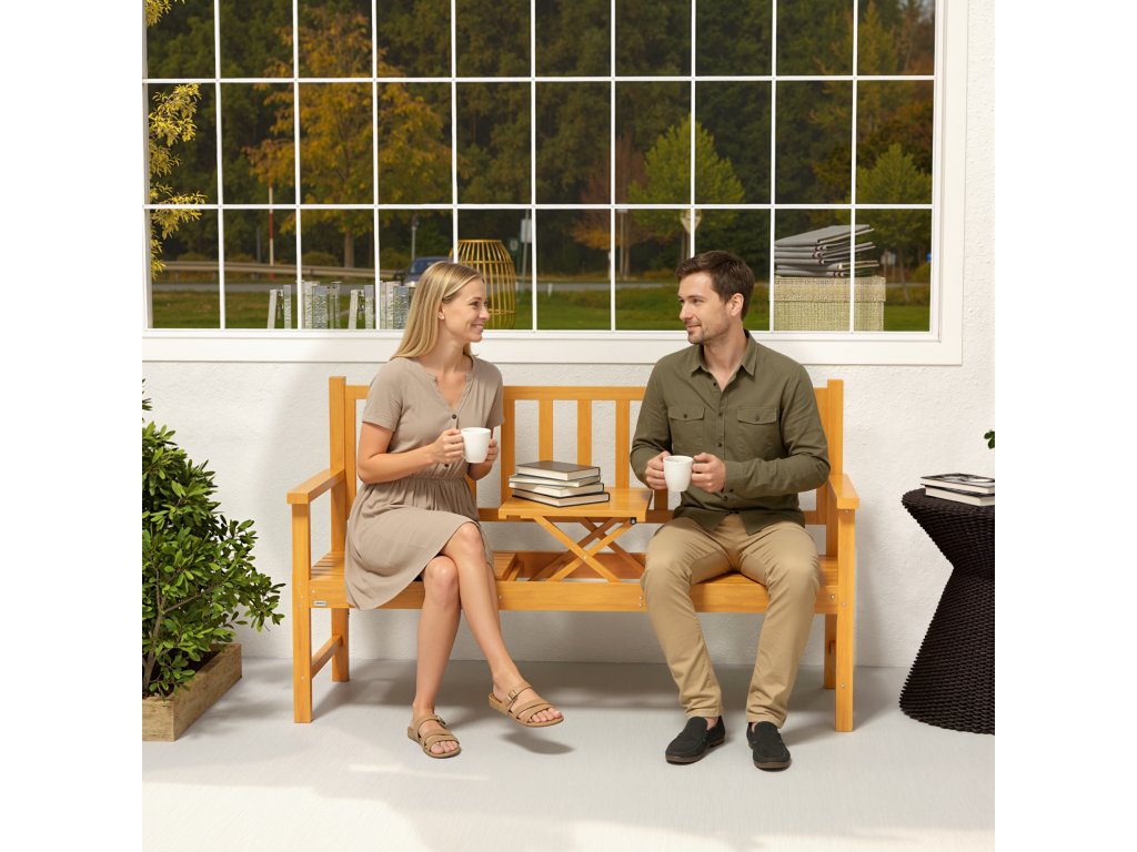 - ✔ Skládací stolek uprostřed promění zahradní lavičku ve funkční prostor