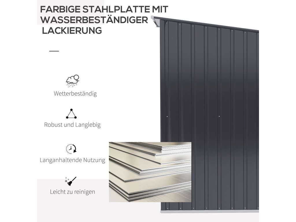 - Robustní konstrukce: Kůlna na nářadí je vyrobena z odolné pozinkované oceli a má povrchovou úpravu odolnou proti povětrnostním vlivům, takže je ideální pro dlouhodobé venkovní použití.