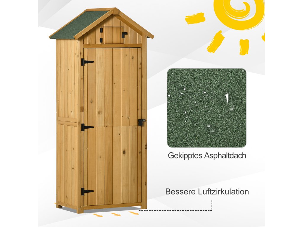 Zahradní skříň od společnosti Outsunny je ideálním řešením pro ukládání zahradního vybavení, grilů a nářadí. Je vyrobena z borovicového a cedrového dřeva. Díky tomu je robustní a odolná. Velké předměty lze uložit ve svislé poloze, zatímco na menší předměty jsou k dispozici tři rohové police. To vnese do vaší zahrady pořádek. Díky svému jednoduchému a rustikálnímu vzhledu je tato zahradní skříň také pěknou venkovní dekorací.