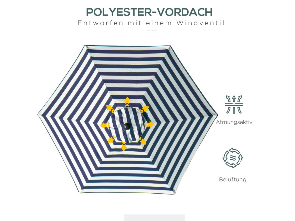 - ✔ Větrací otvory v horní části slunečníku pomáhají udržet stabilitu za větrného počasí