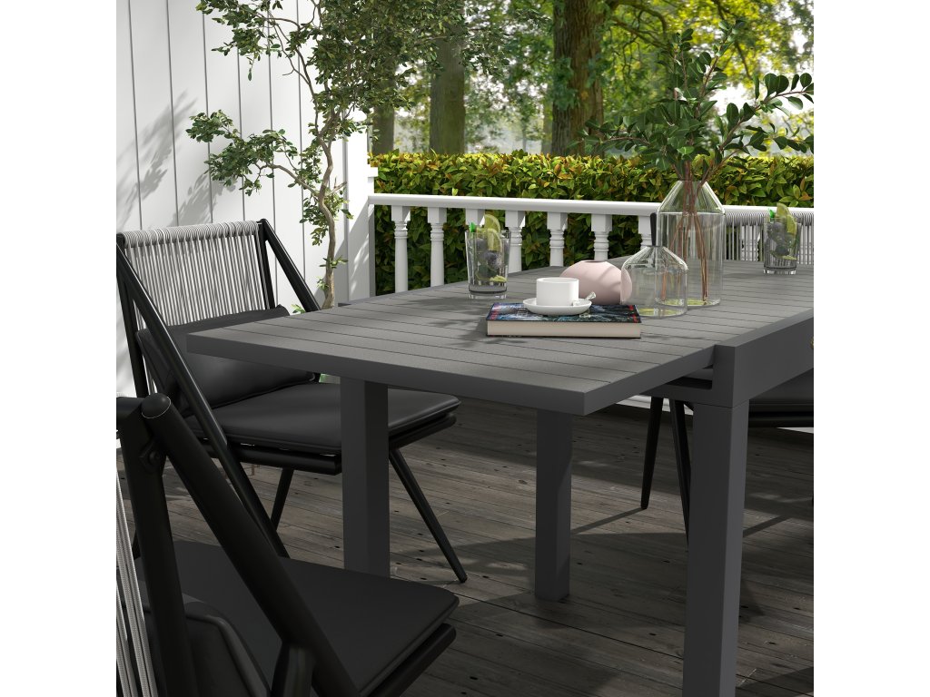 - Hliníkový rám: Tento zahradní stůl má hliníkový rám, který je mimořádně pevný a odolný proti korozi. Práškově lakovaný povrch zvyšuje jeho odolnost a je vhodný pro venkovní i každodenní použití. Jeho nízká hmotnost zajišťuje, že jej lze v případě potřeby snadno přemístit a přemístit na jiné místo