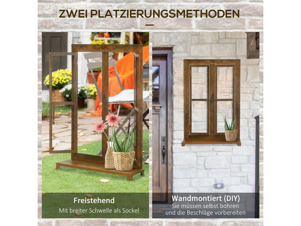 Oživte svou zahradu touto neobvyklou dekorací od společnosti Outsunny. Můžete ji umístit na zem vedle květináčů nebo ji použít jako zahradní dekoraci. Můžete si také připravit vlastní kování a pomocí nářadí ji připevnit na zeď, aby vypadala jako skutečné okno. Ozdobte jej pohádkovými světýlky, popínavými rostlinami nebo čímkoli jiným podle svého vkusu a vytvořte si osobitou zahradní krajinu.