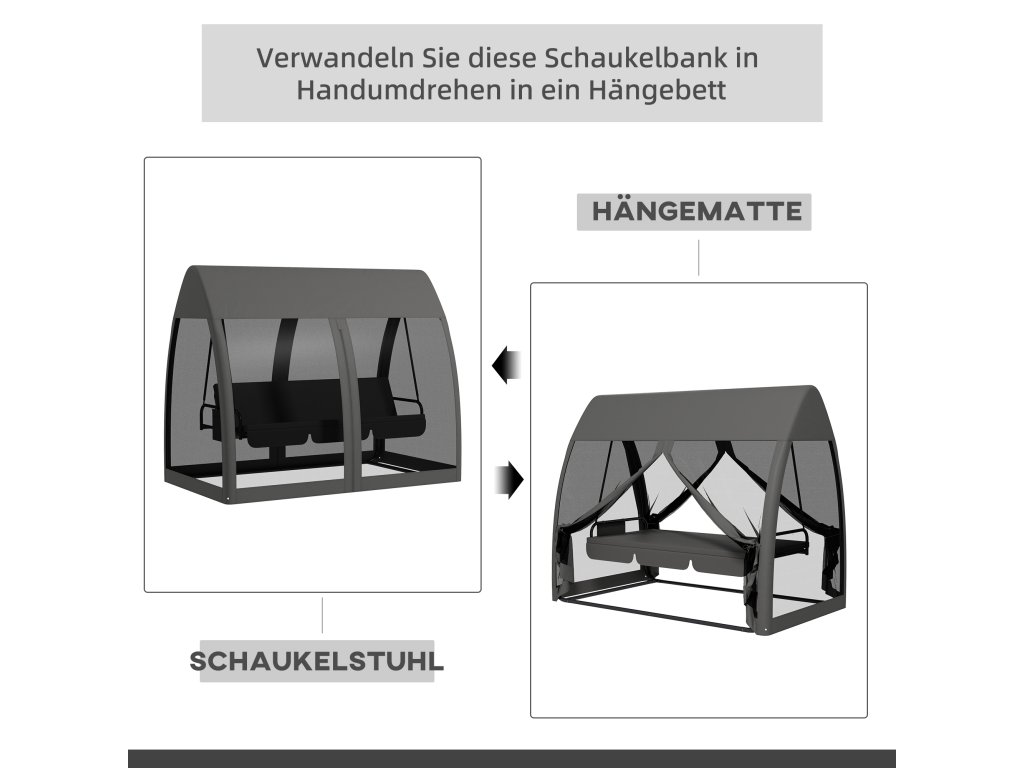Outsuuny 2 v 1 hollywoodská houpačka s funkcí polohování 3místná zahradní houpačka se stříškou, moskytiéra, nosnost houpací lavice až 300 kg, zahradní lehátko na zahradu, terasu, 240 x 140 x 197 cm, šedá barva