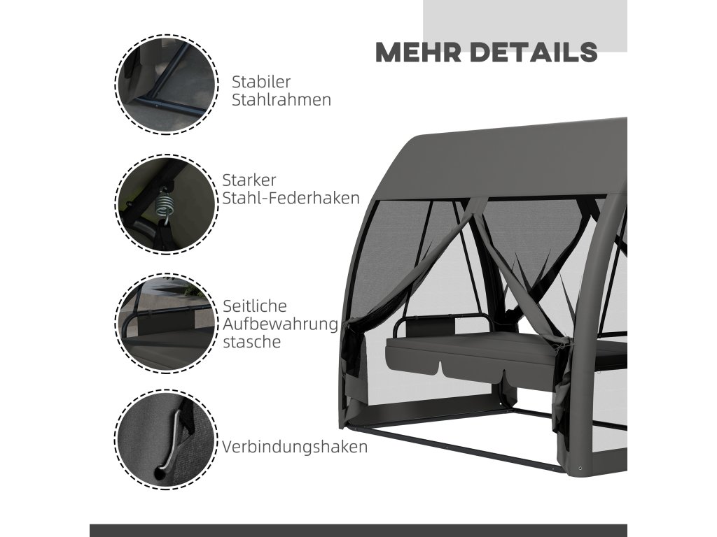 - Síťka proti hmyzu v ceně: Tato zahradní houpačka má stříšku a síťku na zip, která vás ochrání před nežádoucími bzučícími hosty a zároveň propustí čerstvý vzduch