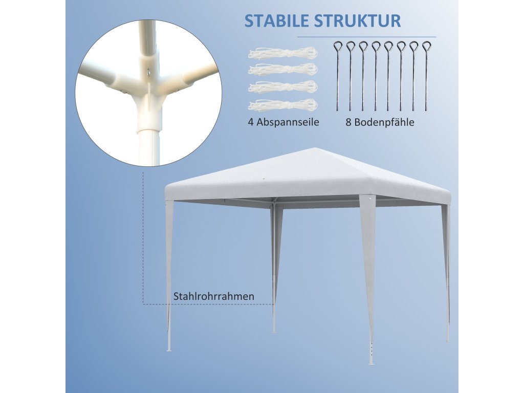- Stabilní a spolehlivý rám: Náš zahradní altán má robustní rám z práškově lakované oceli. Osm kolíků a čtyři upevňovací lana, které jsou součástí dodávky, poskytují dodatečnou bezpečnost, takže si můžete bezstarostně užívat čas strávený venku