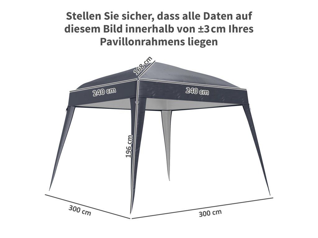 - Abmessungen zum Ersatzbezug: 240L x 240B cm (Oberseite), 300L x 300B cm (Basis). Bitte vergewissern Sie sich anhand des maßstabsgetreuen Produktbildes, dass Ihr Pavillongestell für eine optimale Passform geeignet ist