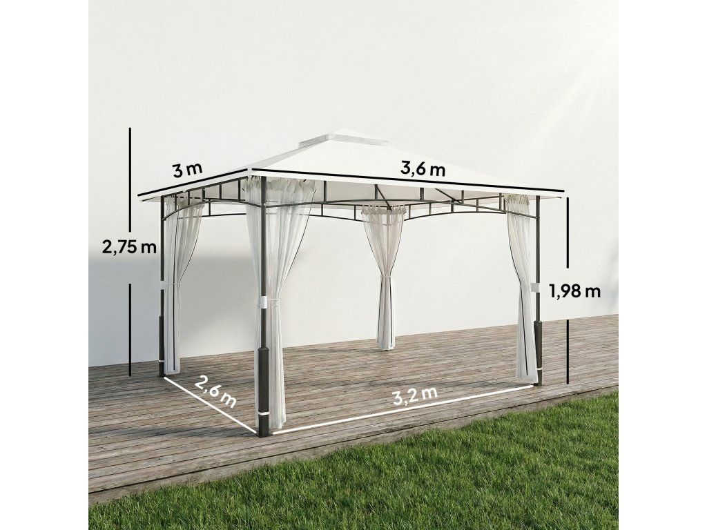 - Rozměry pavilonu: Celkové rozměry: 360L x 300W x 275H cm. Rozteč sloupů: 320L x 260W cm. Výška okapu: 198 cm. Velikost sloupků: Ø38 mm (horní sloupek), 60 x 60 mm (spodní sloupek).