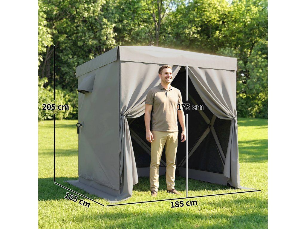 - Rozměry: 185 D x 185 Š cm. Výška vrcholu: 205 cm. Výška okapu: 175 cm. Vhodné pro 2-3 osoby. Nutná montáž.