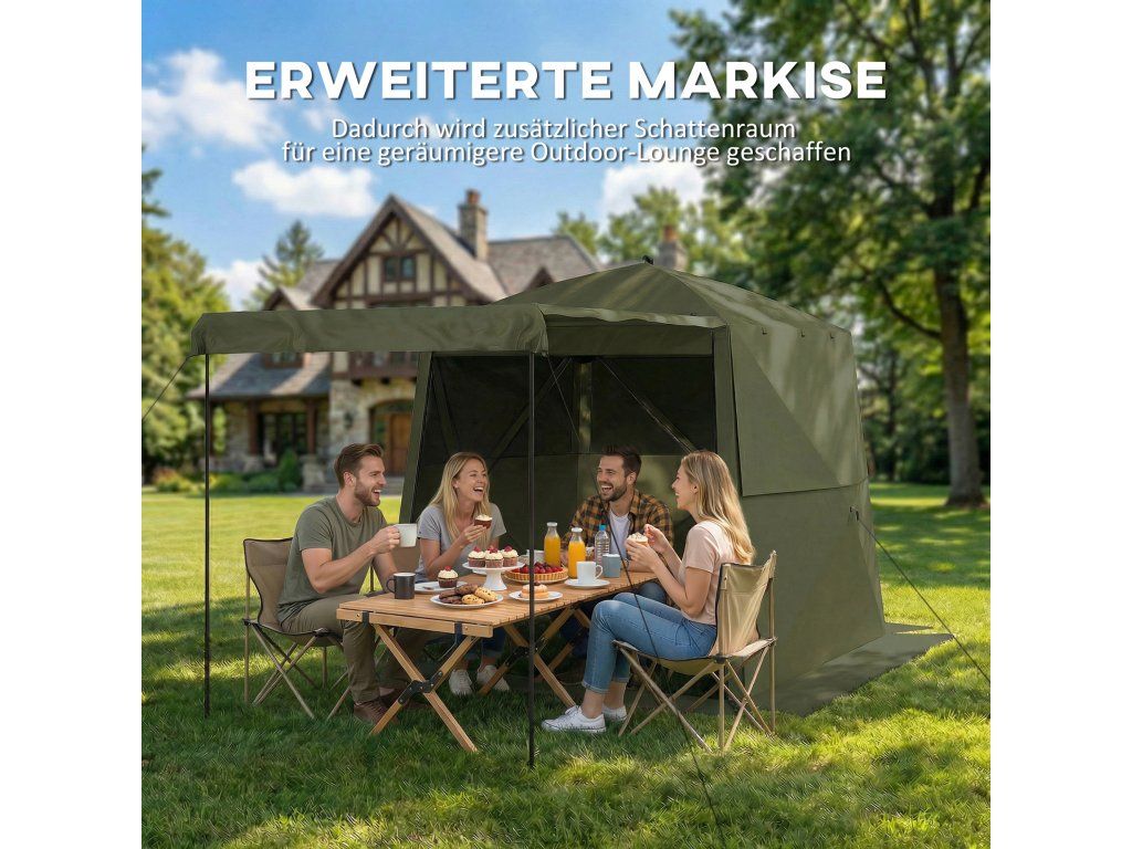 - Rozšířená stínicí markýza: Přední dveře tohoto vysouvacího altánu lze pomocí přiložených tyčí rozšířit na velkorysou markýzu, která vytvoří další stín pro židle a umožní vytvořit prostornější venkovní prostor.