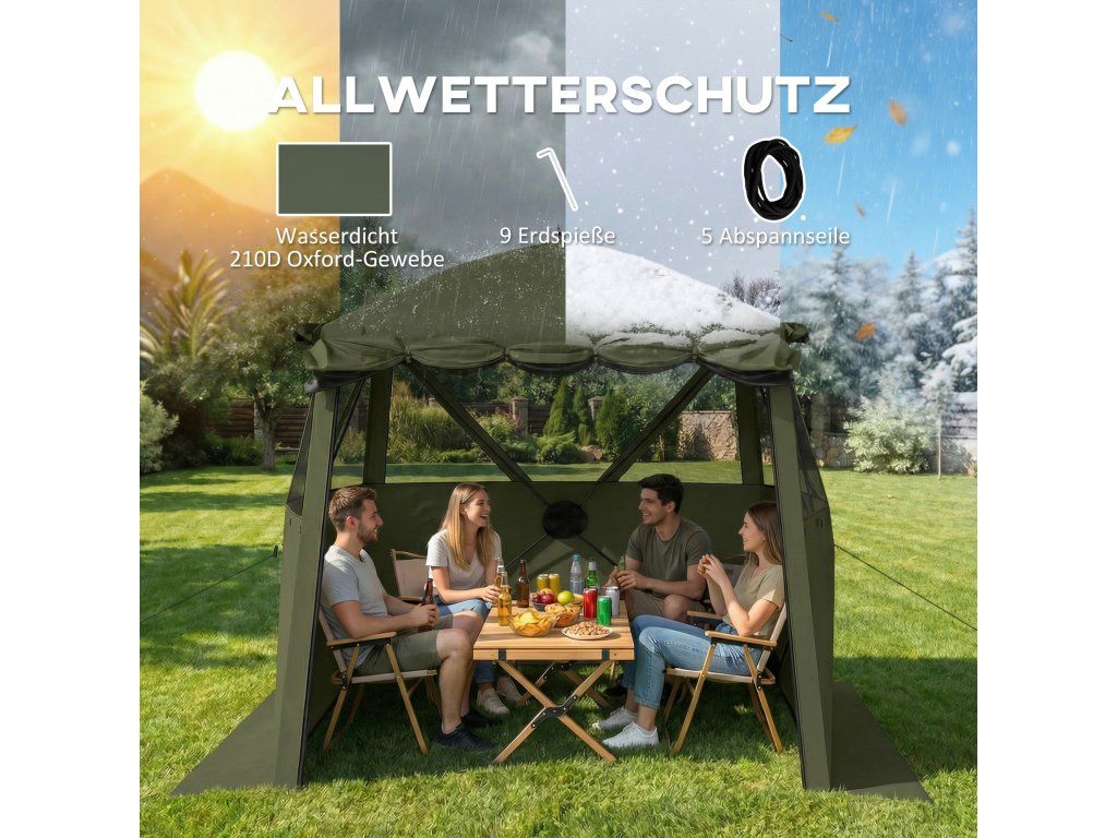 - Ochrana za každého počasí: Tento altán je vyroben z vysoce kvalitní, plně nepromokavé tkaniny 210D Oxford a je stabilizován devíti kotvami do země a pěti lany, a to i při větru o síle 4-5 stupňů.