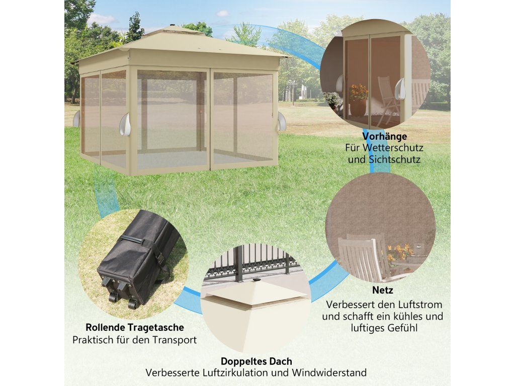 - Rychle se staví a je přenosný: Tento skládací altán s bočními stěnami postaví pouhé dvě osoby během několika minut bez použití nářadí. Je dodáván s přenosnou taškou na kolečkách, díky níž jej lze snadno vzít s sebou na kempování, grilování nebo zahradní party.