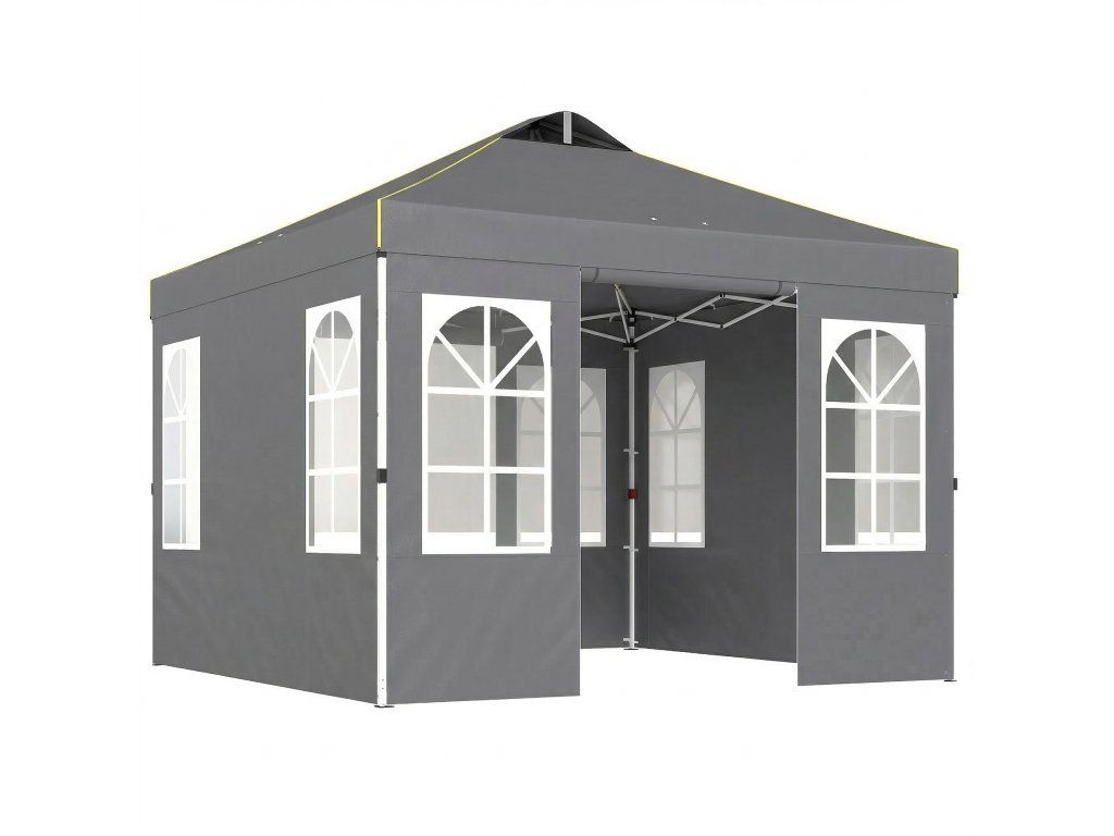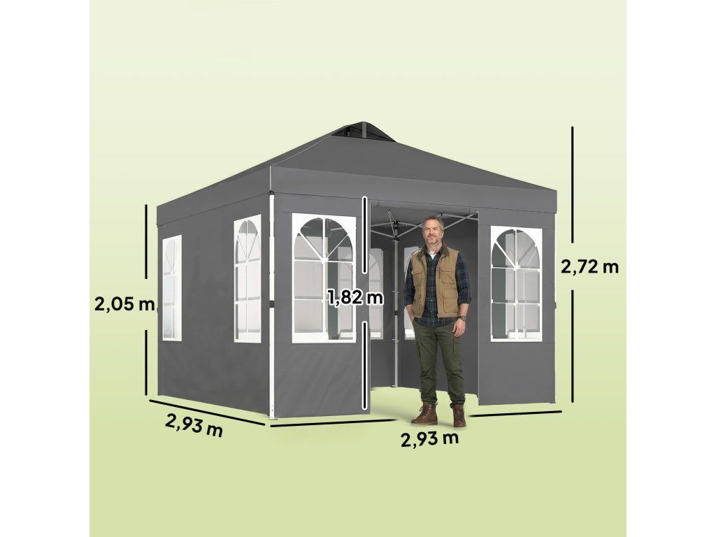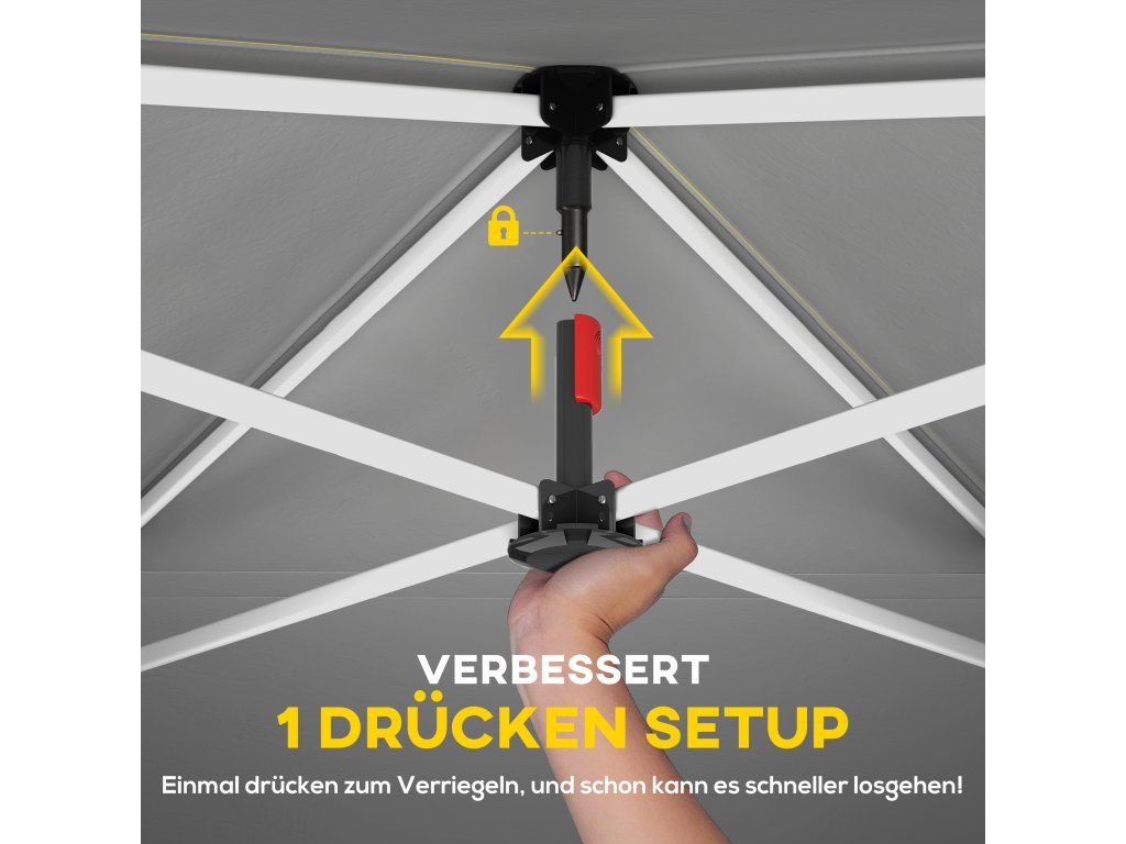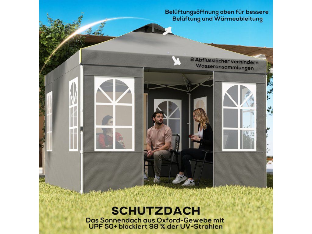 - Sestavení bez námahy: Inovativní vyskakovací konstrukce se zapínáním na jeden knoflík umožňuje sestavení zahradního altánu o rozměrech 3 x 3 m během 30 minut bez použití nářadí. Skládací, prostorově úsporný a přenosný s přenosnou taškou.