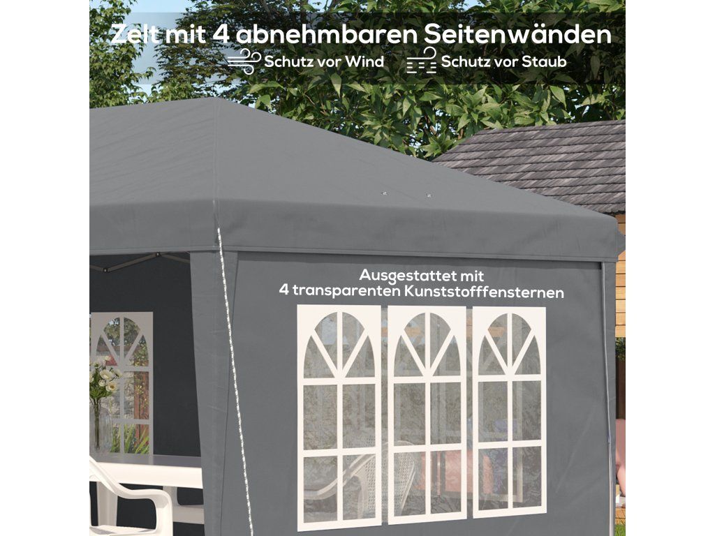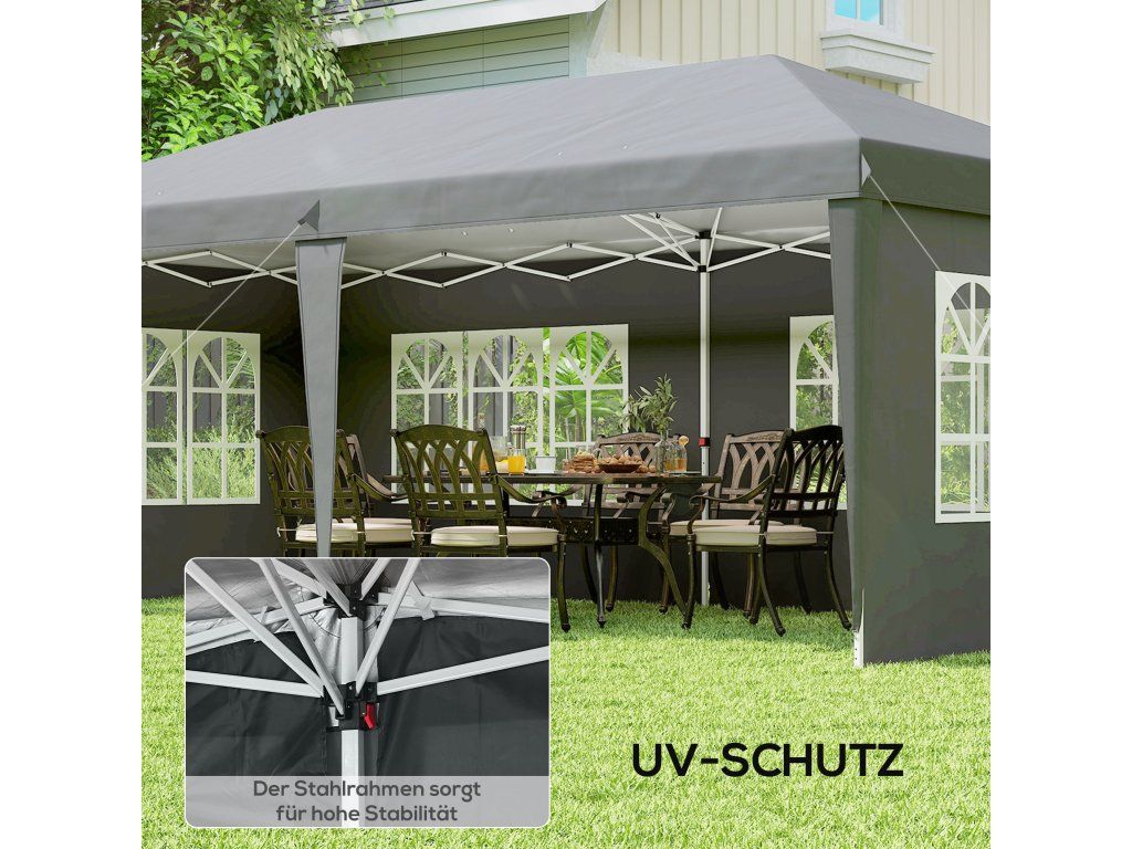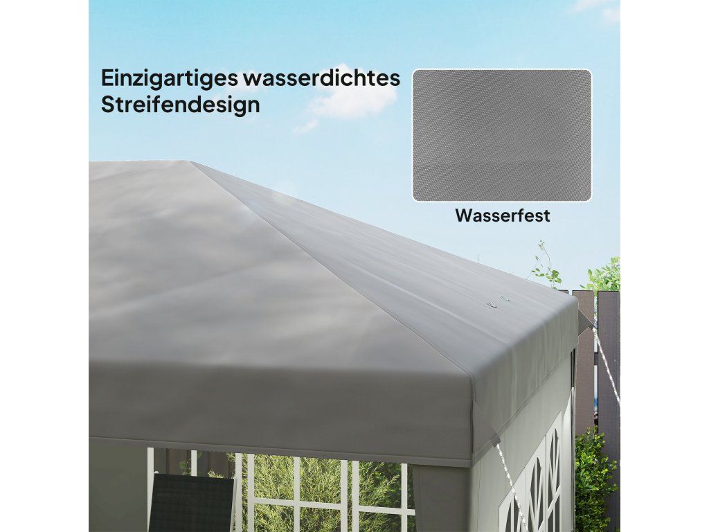 - Čtyři odnímatelné stěny: Polootevřený párty stan, který lze v případě potřeby přeměnit na plně otevřený zahradní pavilon. Střecha je vyrobena z tkaniny 210D Oxford s PVC zátěrem, který poskytuje UV ochranu, jež účinně chrání před UV zářením a dešťovou vodou, a příjemnou atmosféru pro vaše rodinné oslavy.