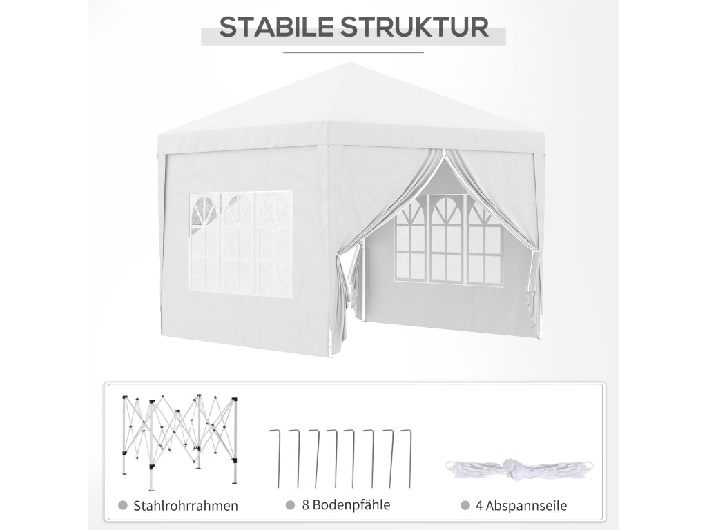 - Stabilita: Robustní, práškově lakovaný ocelový rám skládacího altánu s rovnými podpěrami, včetně napínacích lan a kolíků pro posílení stability