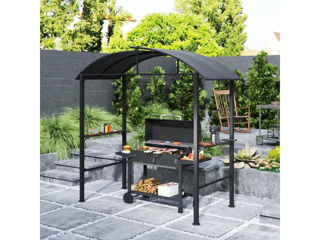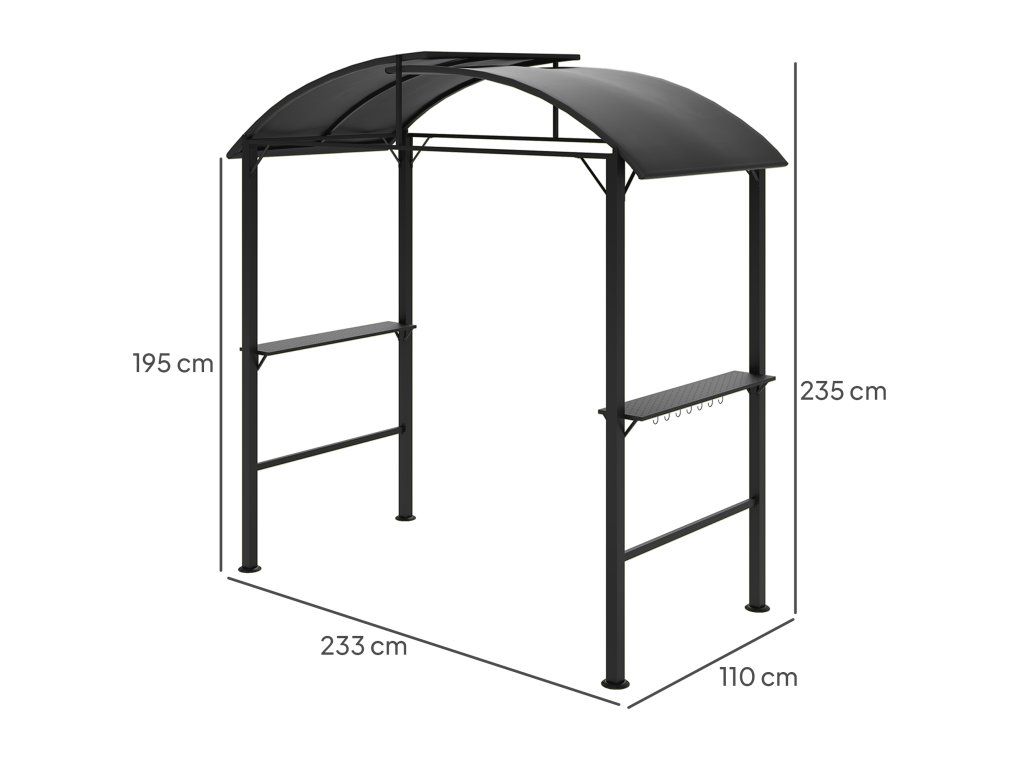 Pavilon na grilování od [NÁZEV ZNAČKY] chrání váš gril před prudkým sluncem. Polyesterová střecha poskytuje ochranu proti UV záření a odsazené střešní prvky umožňují únik kouře. Dvě boční police poskytují prostor pro grilovací náčiní. S tímto praktickým altánem bude grilování ve stínu potěšením!