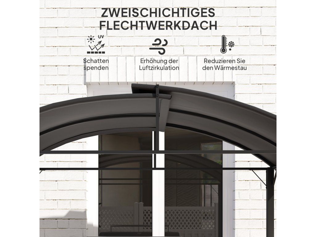 - Vynikající větrání: Střecha pergoly se skládá ze dvou překrývajících se prvků, které vytvářejí zajímavý design. To zajišťuje nejen vynikající cirkulaci vzduchu, ale také vhodné místo, kudy může volně unikat kouř a pachy