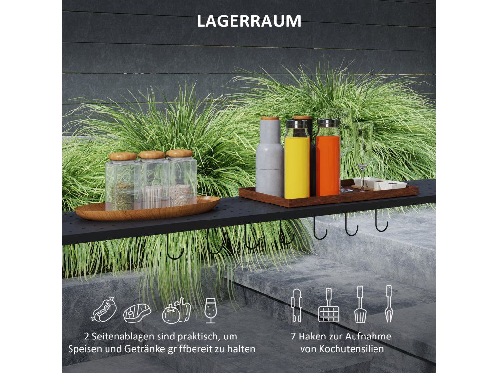 - Boční police: V tomto altánu najdete dostatek prostoru pro kuchyňské náčiní, talíře a příslušenství ke grilování, abyste se mohli pohodlně a komfortně věnovat své grilovací vášni