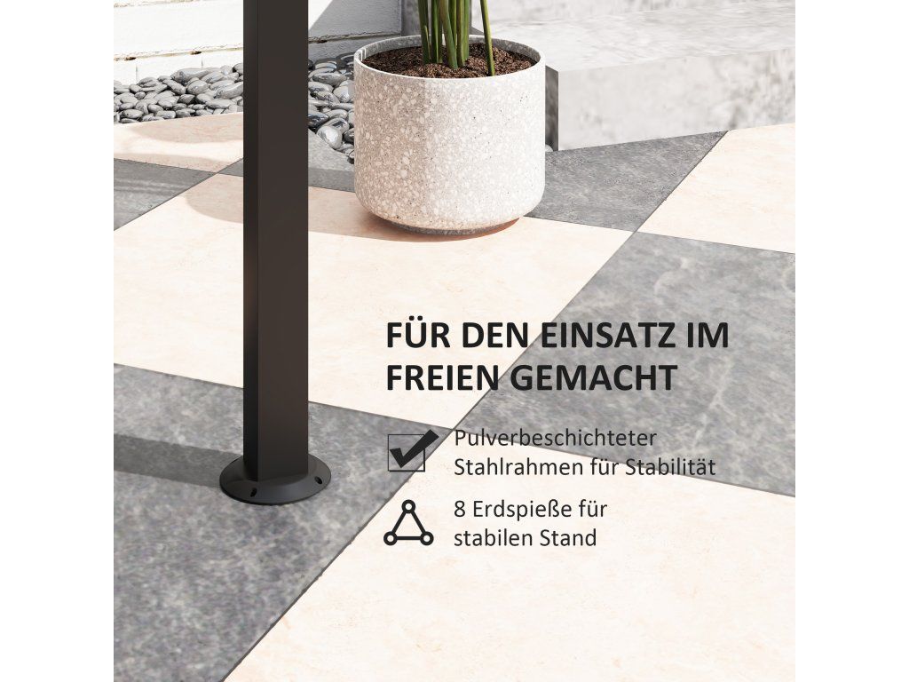 - Ocelový rám: Práškově lakovaný pro větší pevnost, která vydrží mnoho grilovacích sezón. Součástí dodávky jsou zemní hroty pergoly, které zajišťují vynikající stabilitu