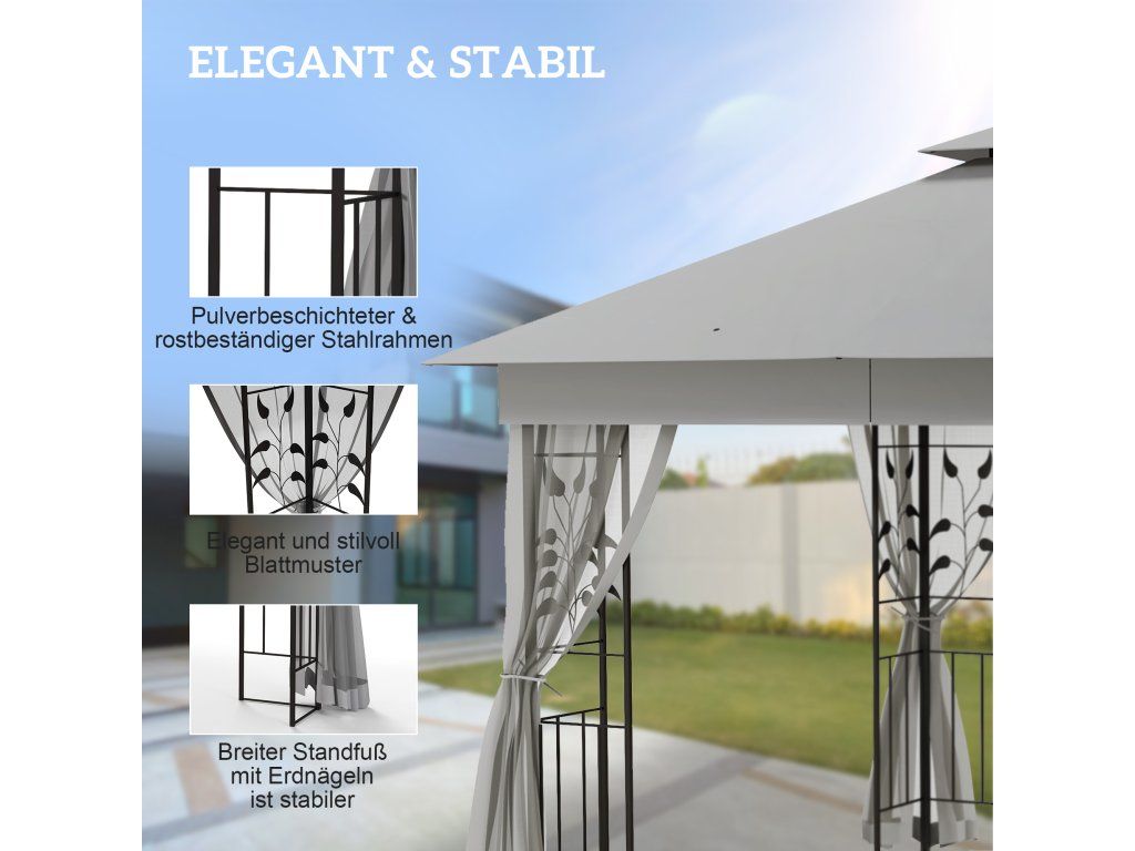 - Stabilní: Základní rám zahradního altánu je vyroben z černě lakovaného kovu. Materiál zaujme svou odolností vůči povětrnostním vlivům a listovými vzory jako ozdobou.