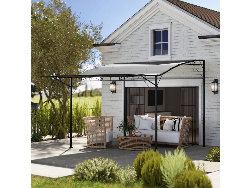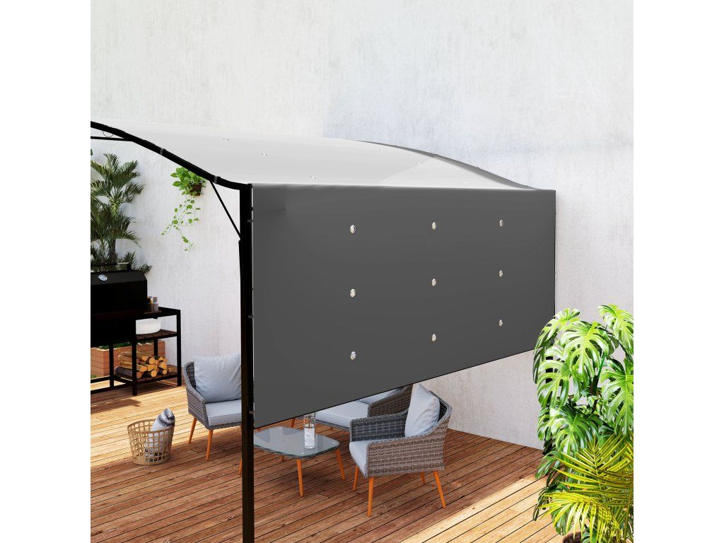 Vytvořte si elegantní místo k odpočinku a společenskému posezení s tímto skvělým volně stojícím krytem terasy od [NÁZEV ZNAČKY]. Altán se skládací střechou nabízí bezpečnou ochranu před sluncem a mírným deštěm. Boční nástavec střechy lze navíc v případě potřeby odklopit a přiklopit, aby poskytl více stínu nebo lepší ochranu před větrem. Robustní ocelový rám lze v případě potřeby připevnit také na zeď - ideální na terasu a zahradu.