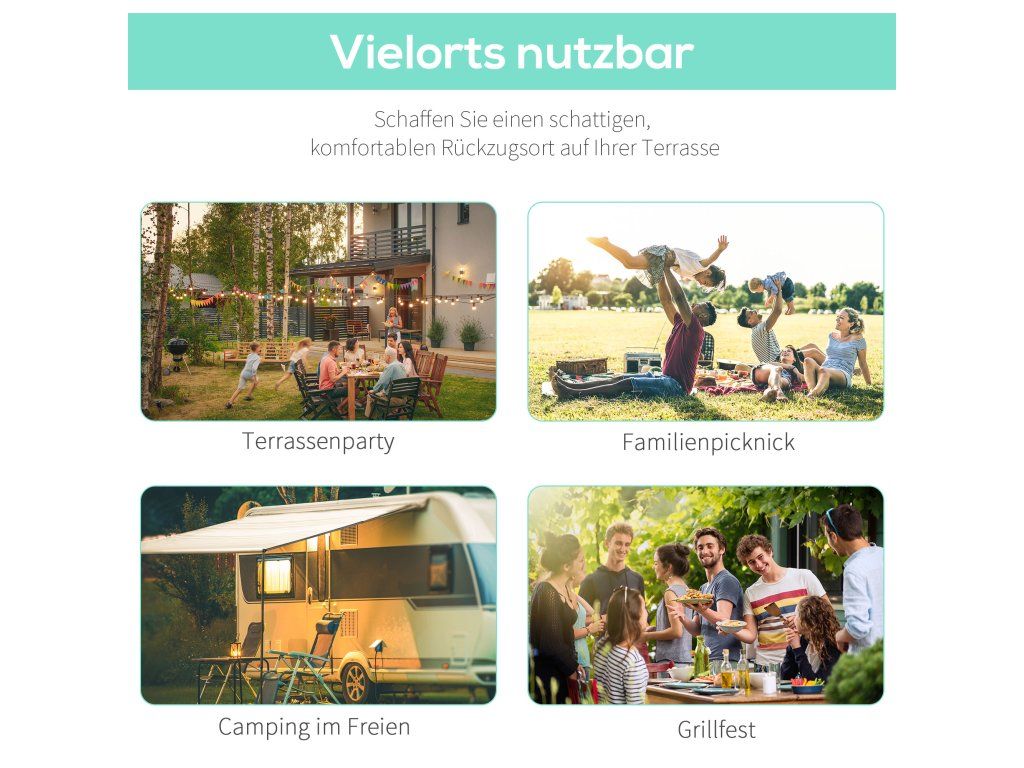 - ✔ Sklopný střešní nástavec výsuvného altánu lze použít jako ochranu před sluncem nebo větrem