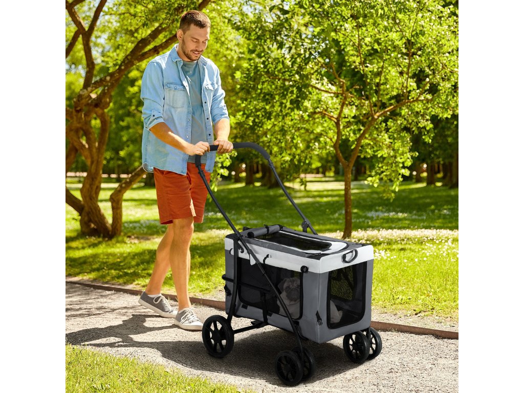 - Skládací kočárek pro domácí zvířata: Tento kočárek pro psy má uživatelsky přívětivý skládací mechanismus, díky němuž je vysoce přenosný a lze jej uložit do kufru auta. Jedná se o skutečný "převrat", který můžete využít při cestování, nakupování, cestě k veterináři nebo každodenních procházkách se svými štěňaty
