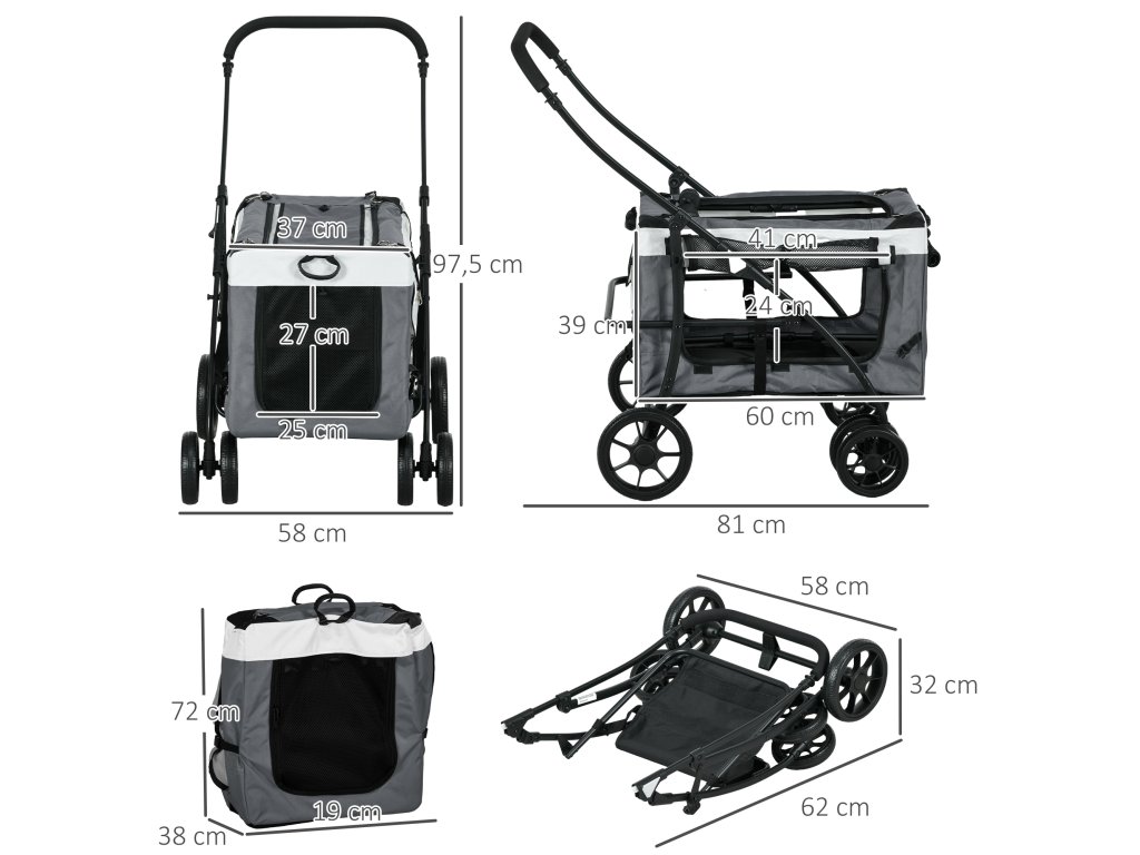 - Rozměry: 81L x 58W x 97,5V cm. Hlavní část: 60L x 37W x 39H cm. Složený rám: 78L x 58W x 27H cm. Složený nosič: 39L x 37W x 12H cm. Maximální zatížení: 15 kg. Vhodné pro miniaturní psy a malé psy do 10 kg a délky těla 40 cm. Nutná montáž