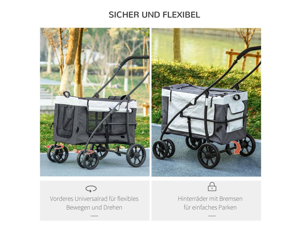 Kočárek PawHut je praktickým řešením pro majitele zvířat, kteří jsou často na cestách. Díky skládacímu rámu se snadno skladuje a přepravuje, což je ideální pro cestování. Měkké polstrování poskytuje vašemu mazlíčkovi pohodlné místo během procházek. Dvě bezpečnostní vodítka a dvě zadní brzdy zajišťují bezpečnost vašeho mazlíčka. Vozík pro psy je skvělou volbou pro majitele zvířat, kteří chtějí se svým mazlíčkem cestovat.
