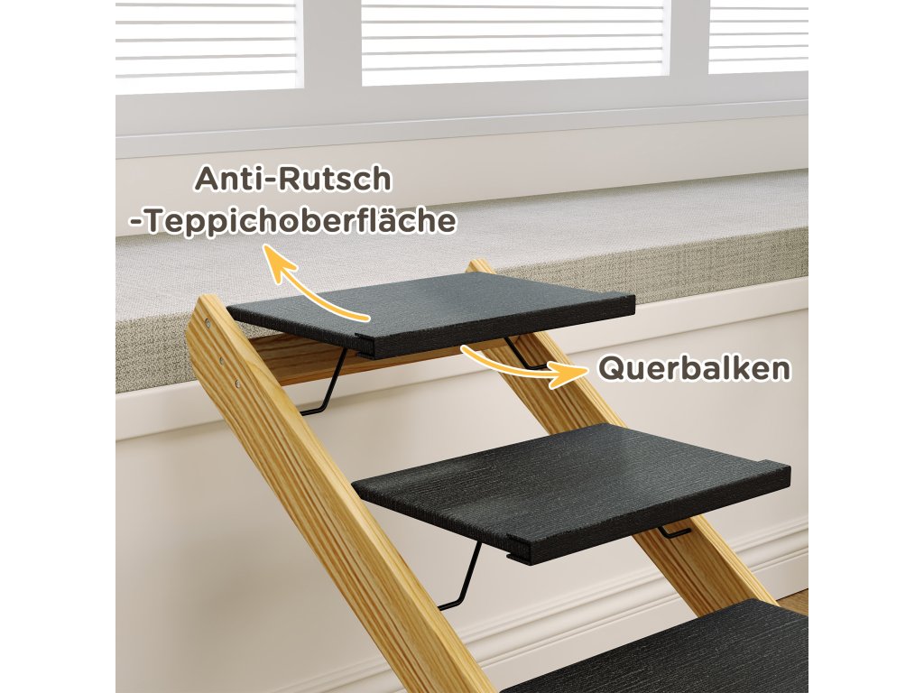- Robustní dřevěná konstrukce: Toto psí schodiště vyrobené z borovicového dřeva s měkkým kobercovým povrchem unese velké psy do 40 kg a je vhodné zejména pro starší domácí zvířata nebo zvířata s omezenou pohyblivostí