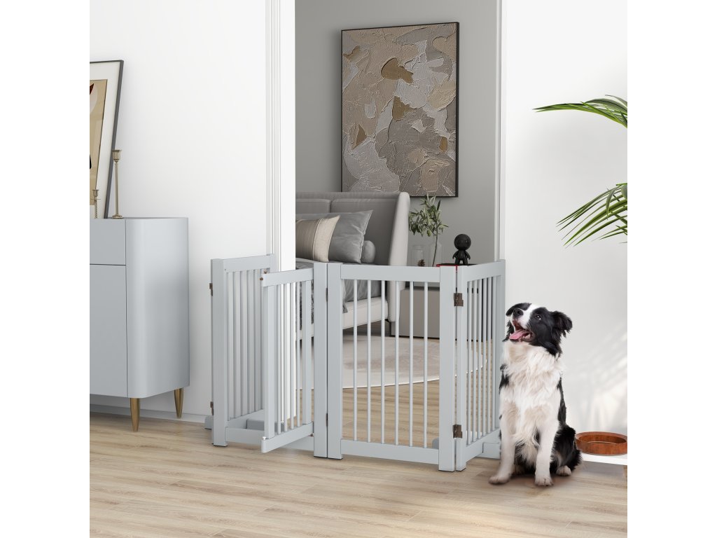 PawHut 4-dílná zábrana pro psy, 204 x 75 cm Skládací bezpečnostní branka s dvířky, volně stojící branka pro psy se 2 podpěrnými nohami, dřevěná branka na schody do chodby, kuchyně, na schody, světle šedá | Aosom