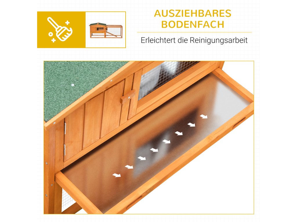 Prostorná bouda pro malá zvířata od společnosti PawHut vám přinese spoustu radosti. Skládá se z vnitřního a venkovního prostoru, které jsou propojeny rampou. Střešní mříž venkovního prostoru lze odklopit, zatímco vnitřní prostor je chráněn před povětrnostními vlivy asfaltovou střechou. Odnímatelná podlahová vana usnadňuje čištění. Díky této boudě můžete svým domácím mazlíčkům nebo jiným malým zvířatům nabídnout pohyb a místo k ústupu - přesně tak, jak to potřebují.