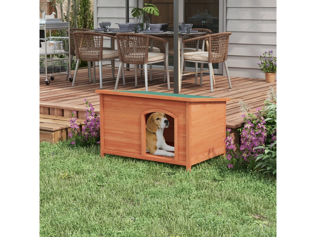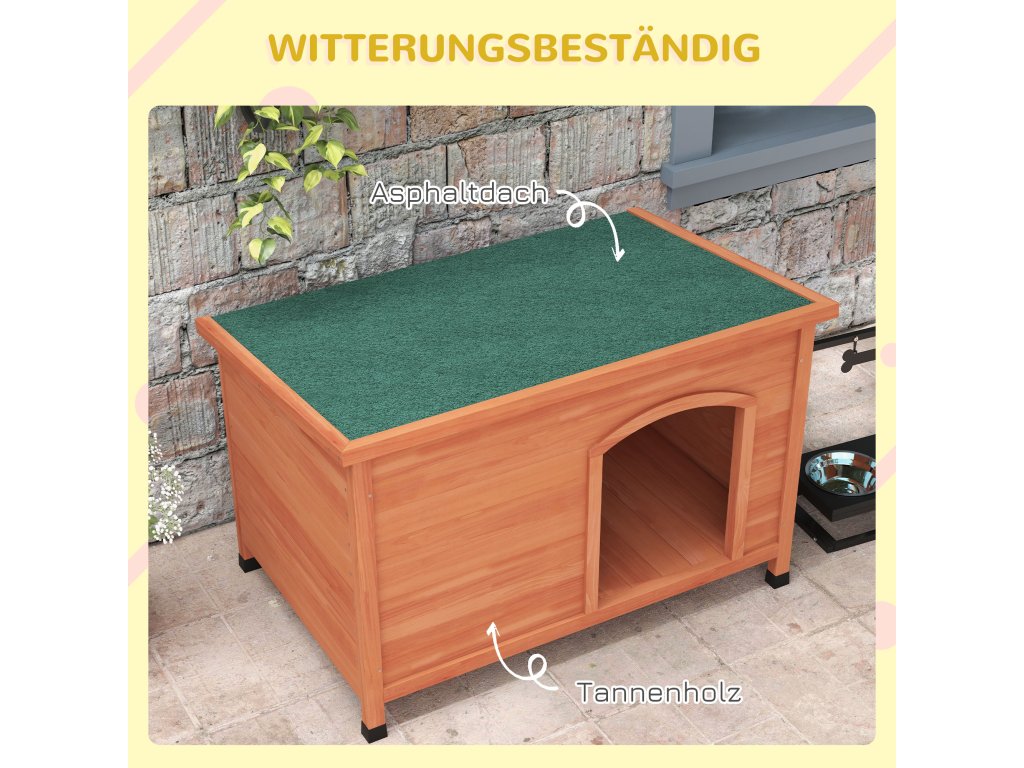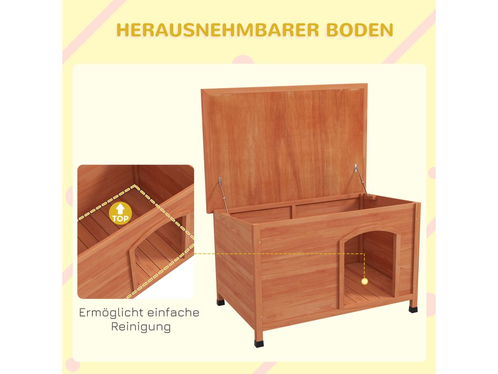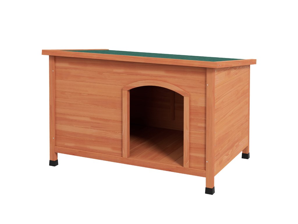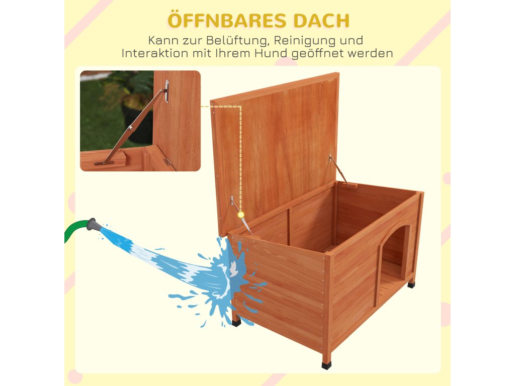 - Otevírací asfaltová střecha: Dřevěná psí bouda je vybavena výklopnou asfaltovou střechou, která ji chrání před povětrnostními vlivy a kterou lze otevřít pro větrání, čištění a interakci s vaším psem