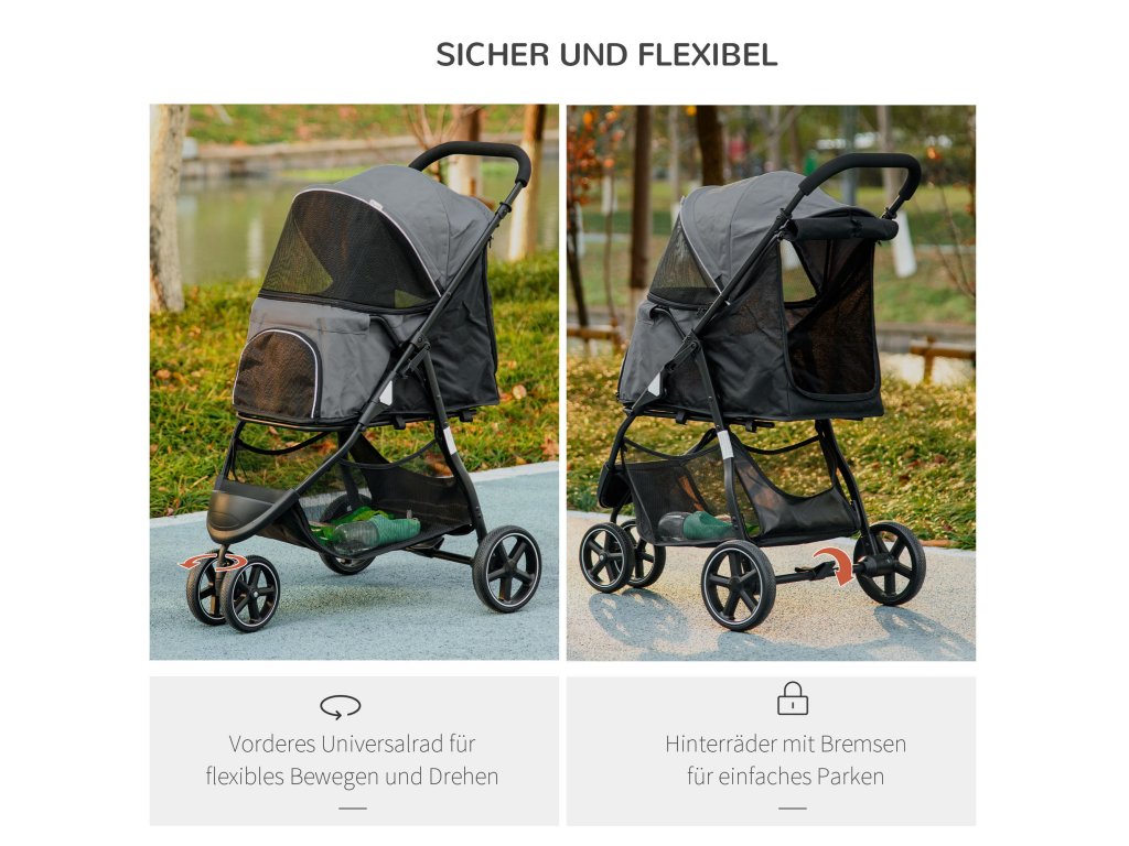 PawHut kočárek pro domácí mazlíčky skládací s pláštěnkou a bezpečnostním vodítkem, úložný koš pro malé psy, Oxford grey | Aosom.de