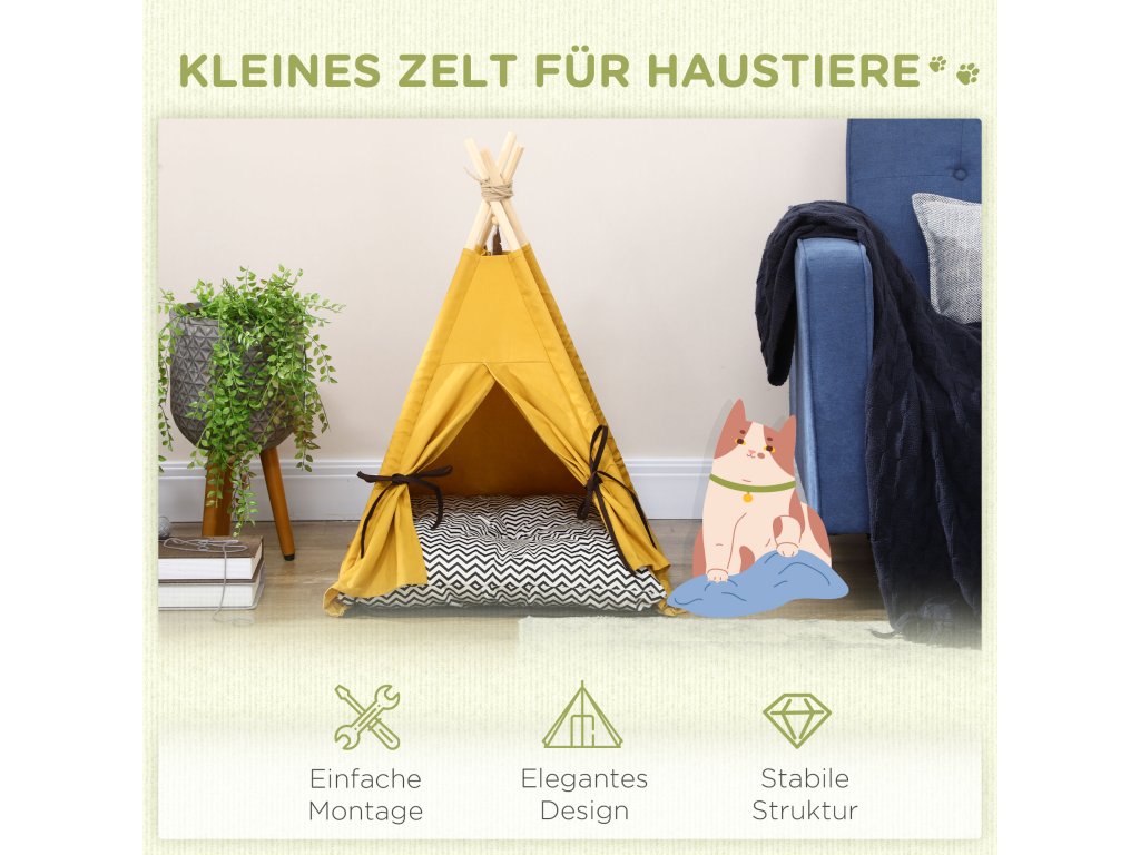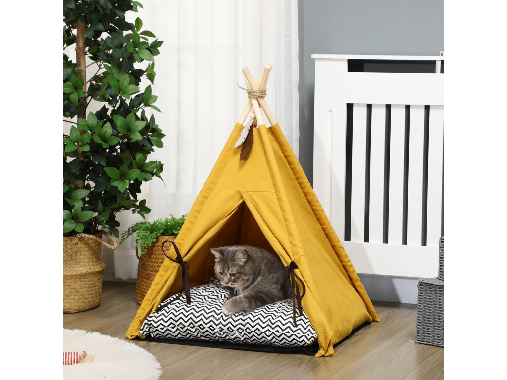 PawHut kočičí domeček teepee stan pro psy s polštářem, protiskluzový, s míčkem na hraní, z borovicového dřeva, vnitřní, žlutý| Aosom