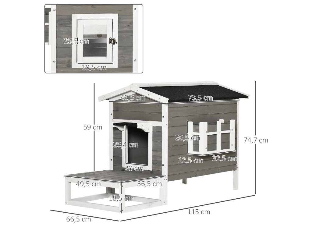 Tato vila pro kočky od společnosti PawHut je vyrobena z vysoce kvalitního jedlového dřeva a nabízí vašim mazlíčkům bezpečné útočiště za každého počasí. Velká terasa je ideálním místem pro hraní a lenošení na slunci. Domeček je obzvláště pohodlný pro volně se pohybující kočky. Díky voděodolnému nátěru střechy a zvýšené podlaze zůstane domeček vždy suchý. Udělejte svým kočkám radost jejich vlastním domečkem!